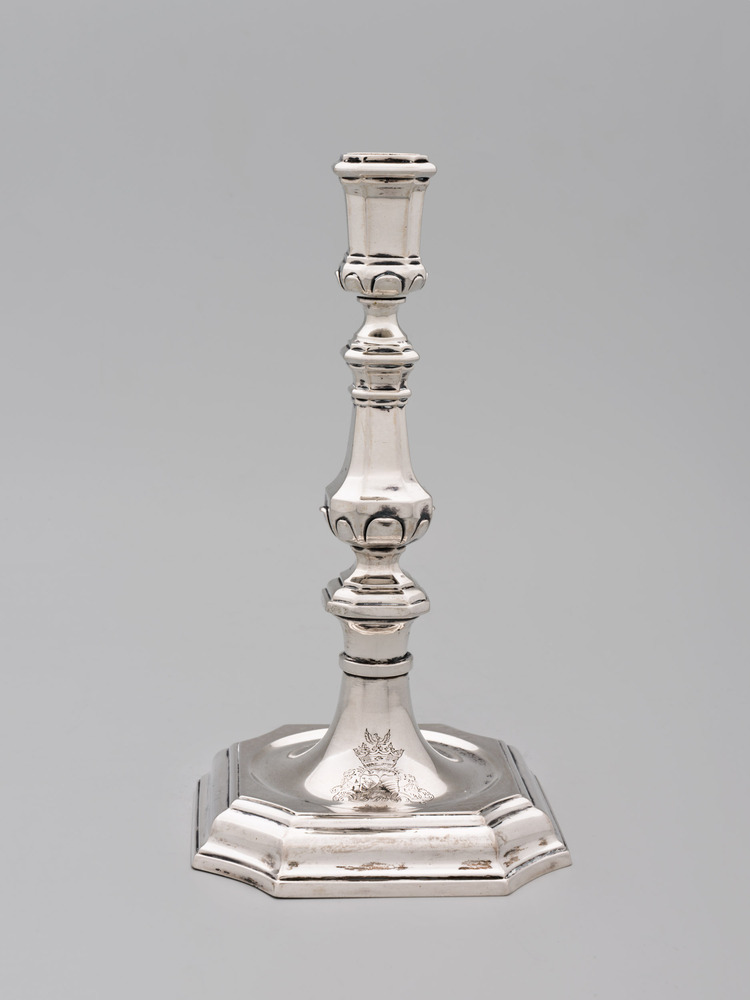 Kandelaar met gegraveerde alliantiewapen van Van der...