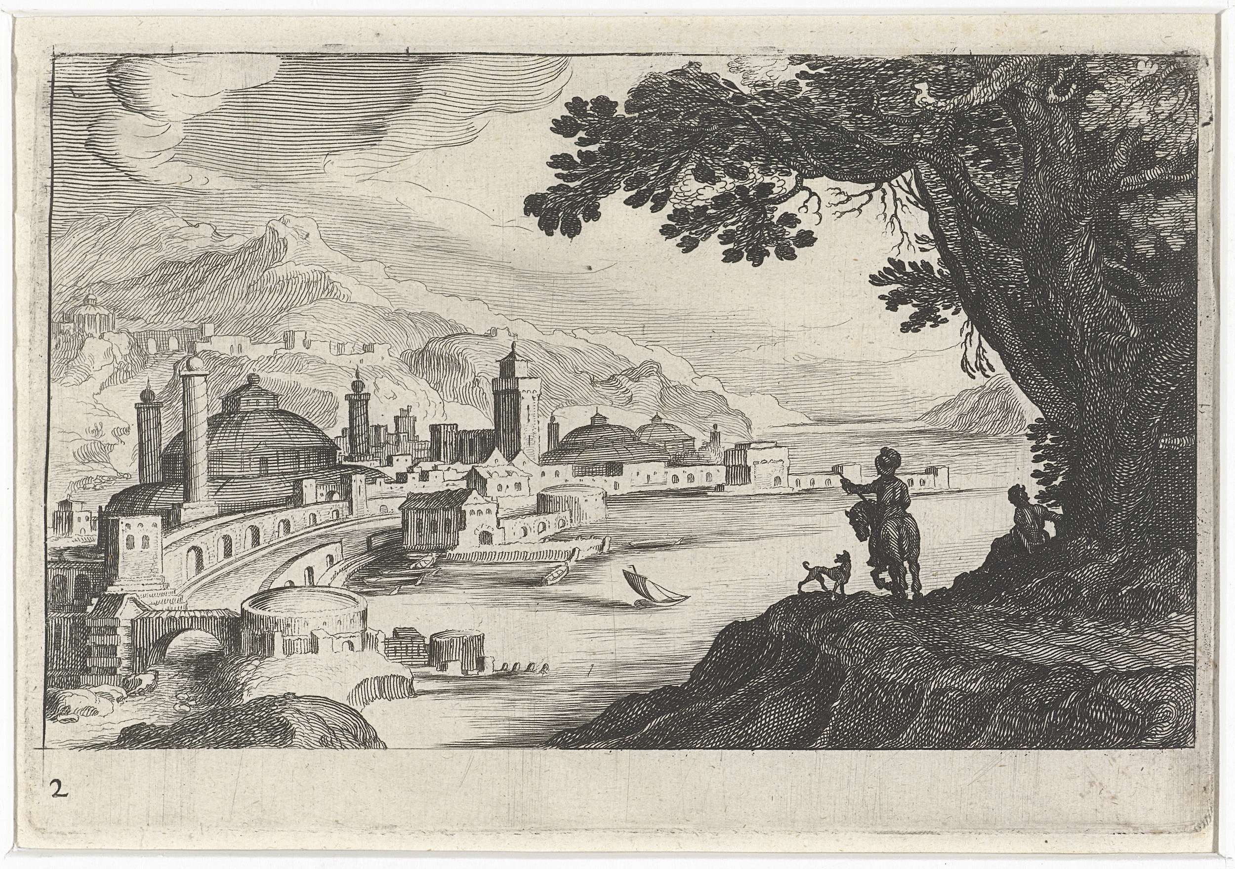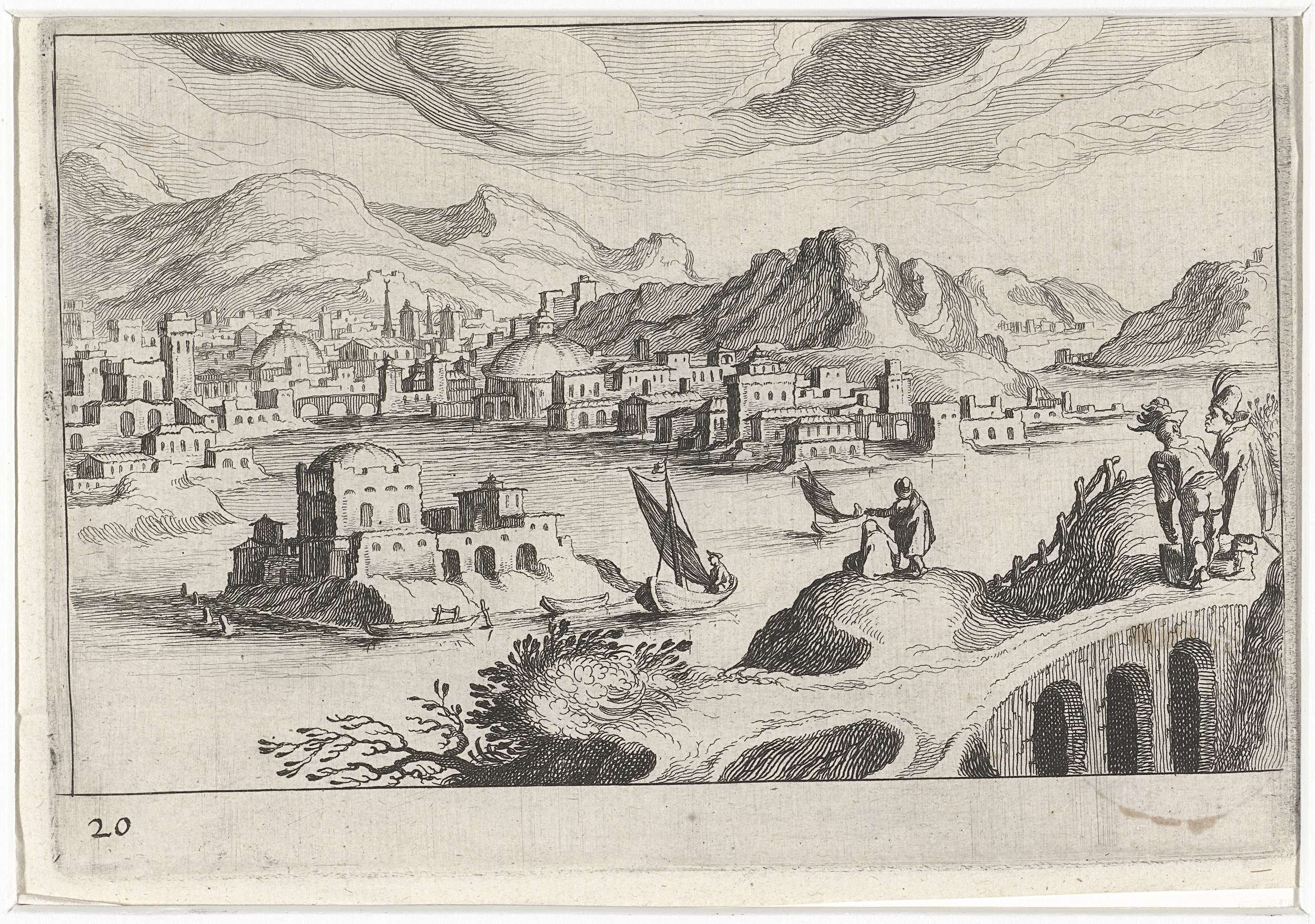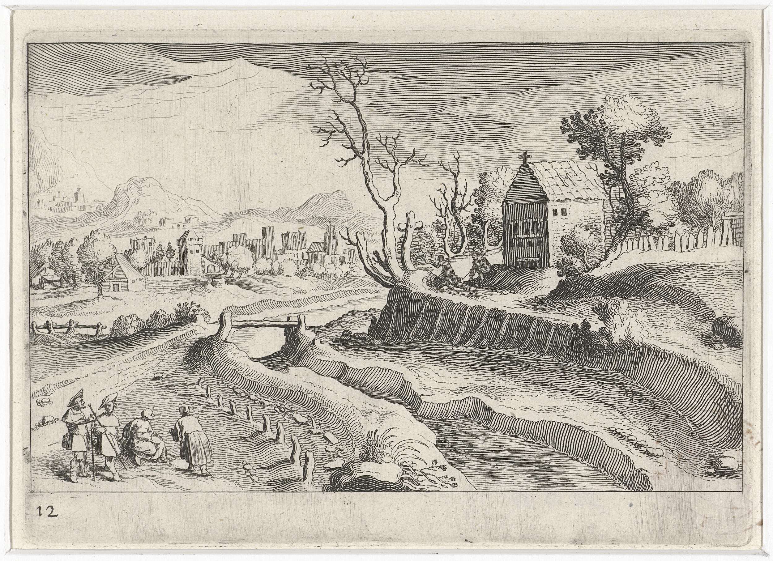 Emmäusgangers voor een stadspoort in een berglandschap