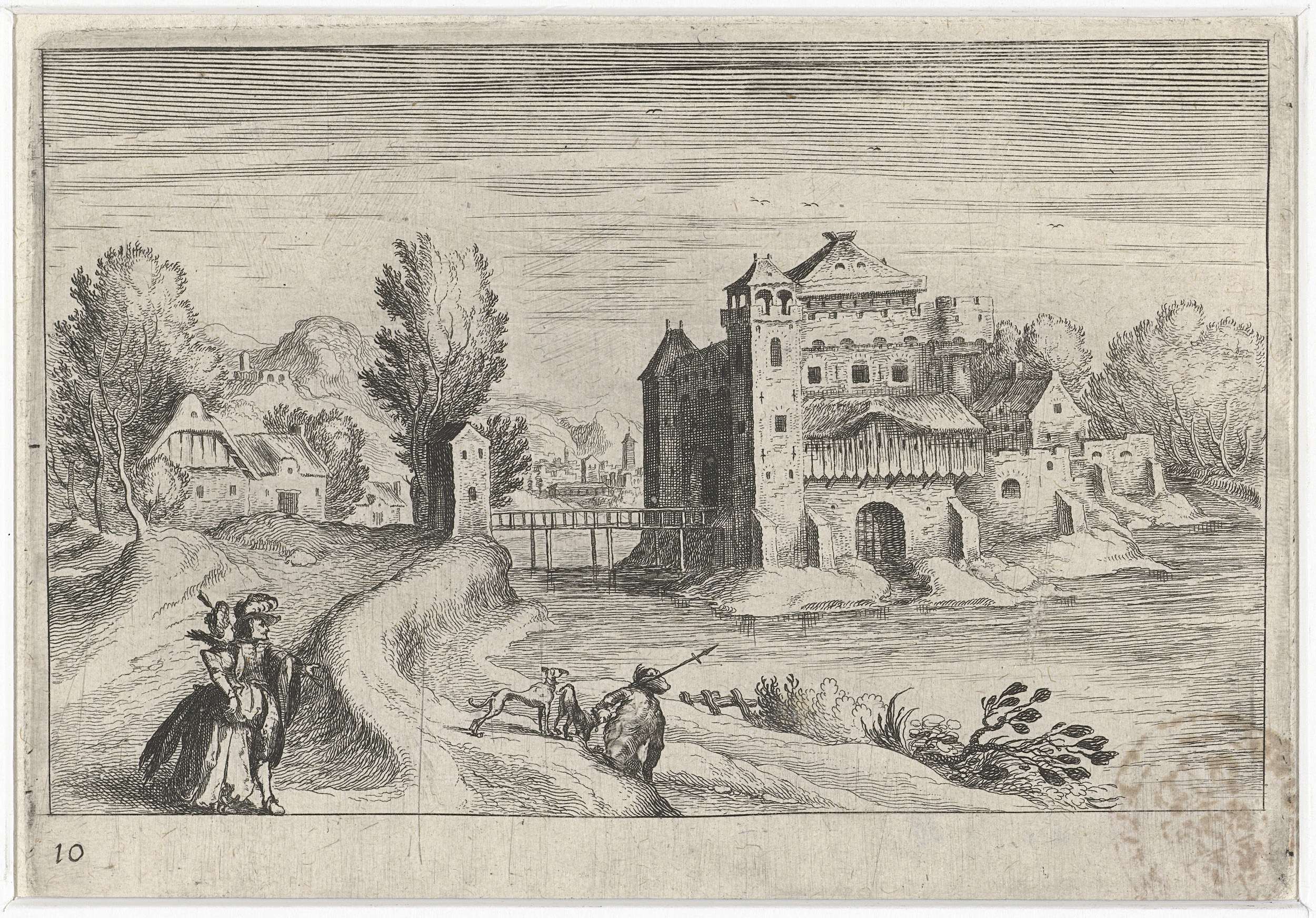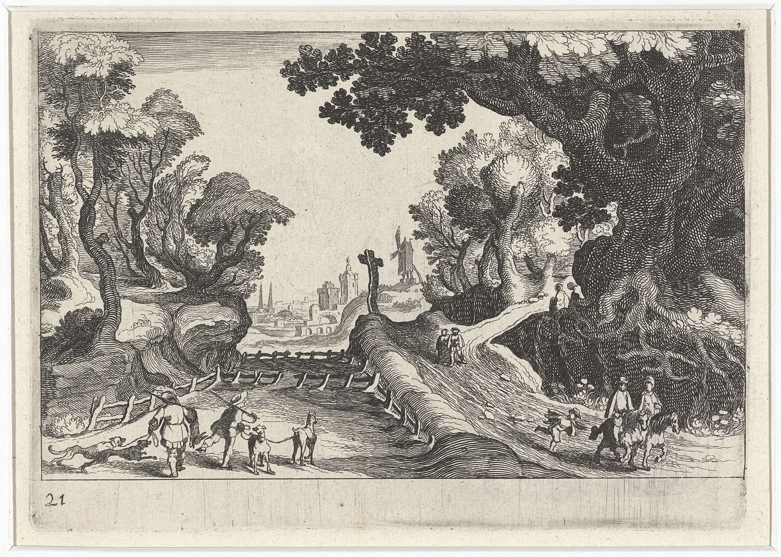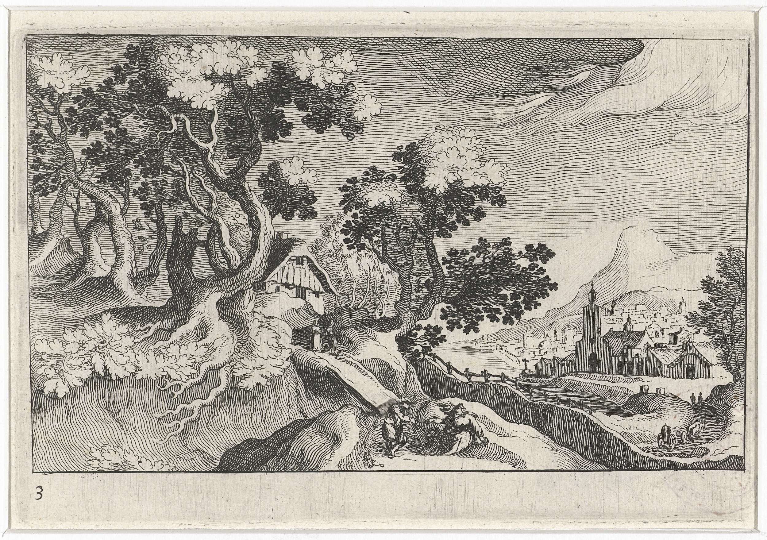 Bosrijk heuvellandschap met gebouwen en figuren