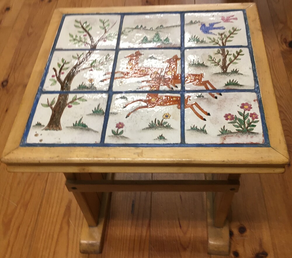houten tafel met ingelegde tegels van keramiek in sg...