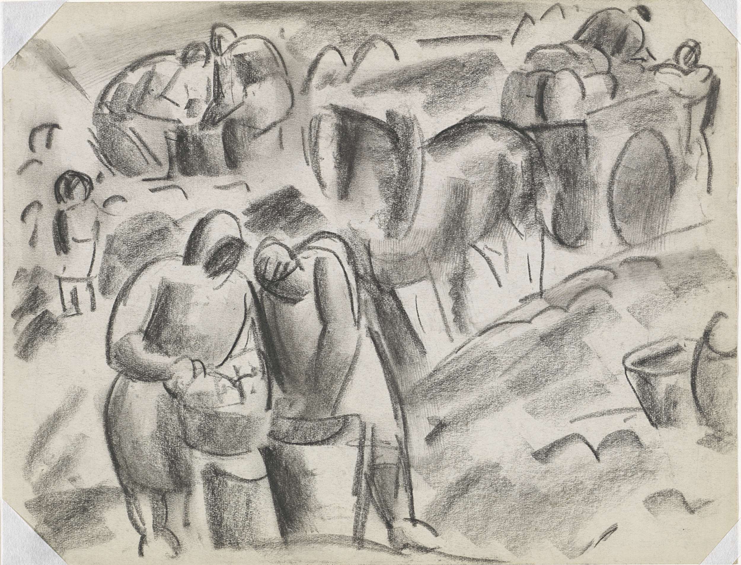 Studieblad met zeven schetsjes van gebukte aardappel...