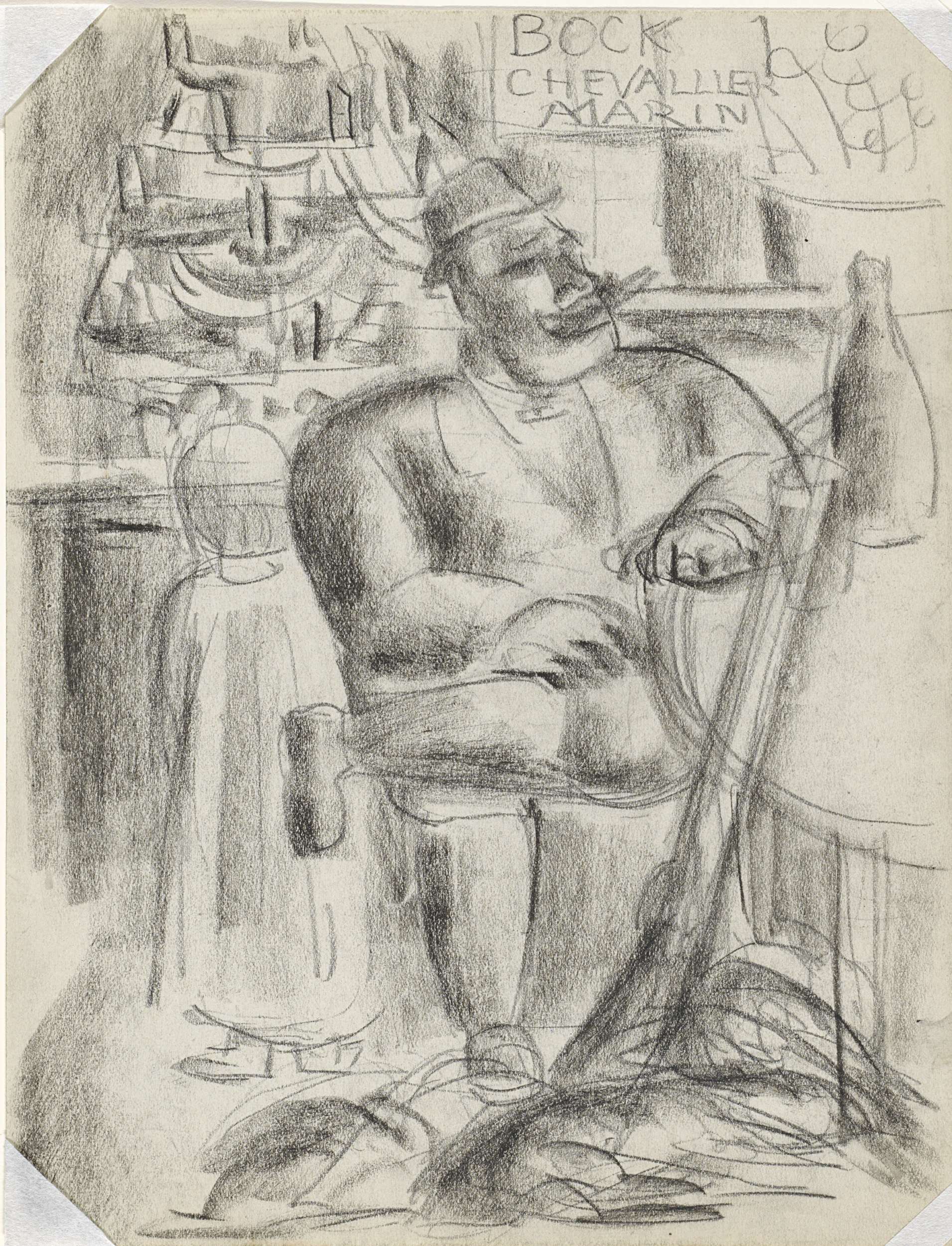 Jager zittend aan cafétafel, in zwart krijt