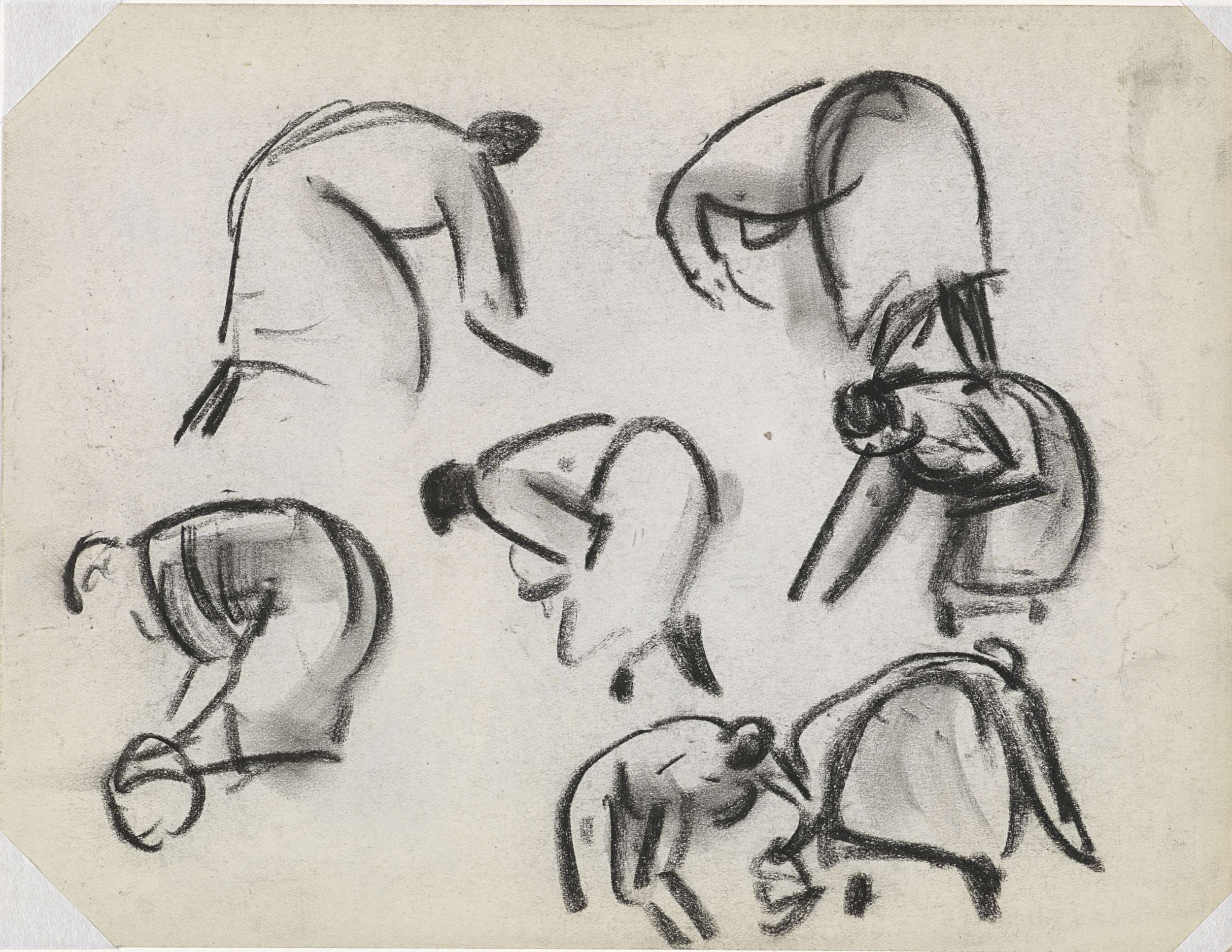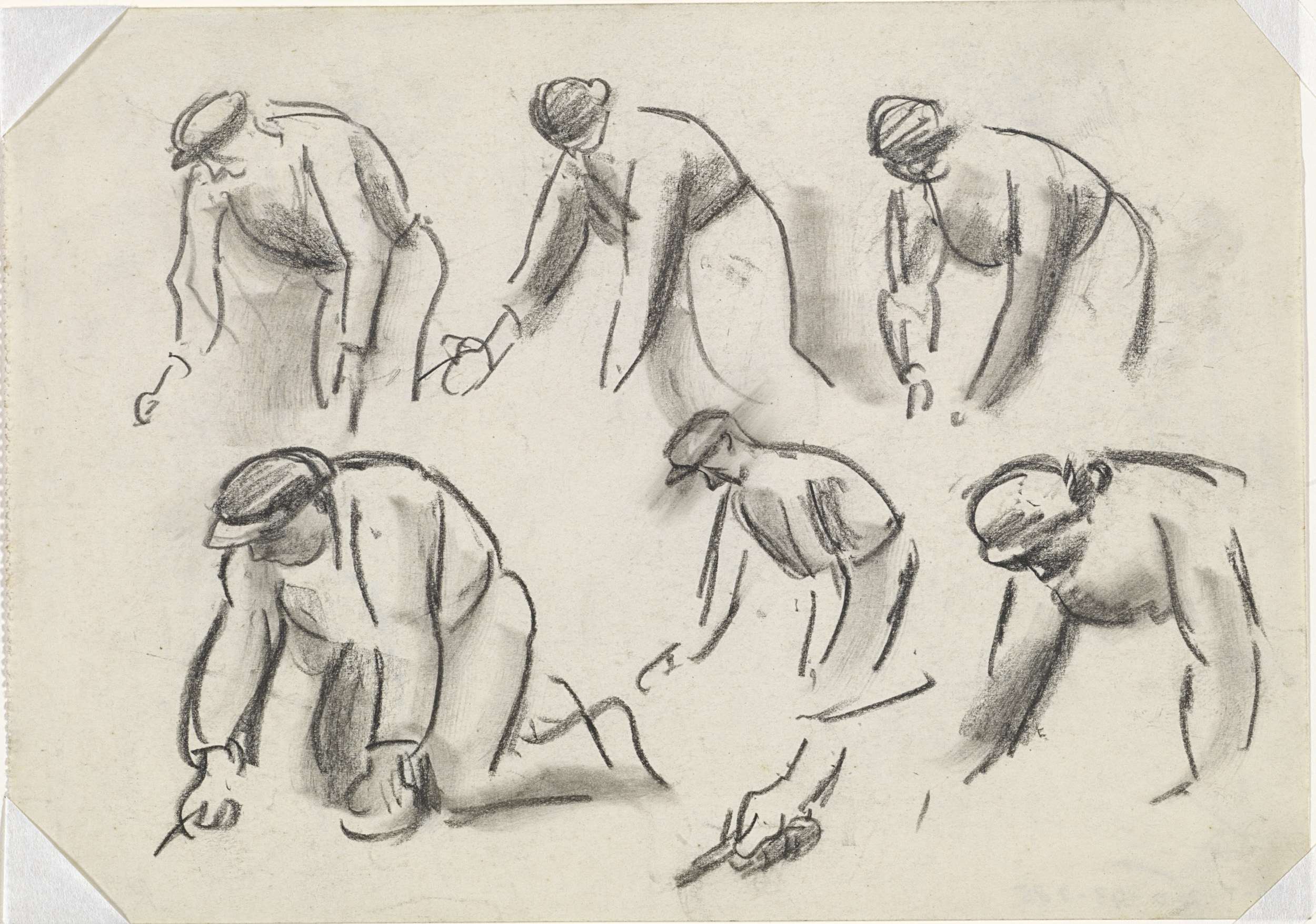 Studieblad met 6 schetsjes van knielende aardappelro...