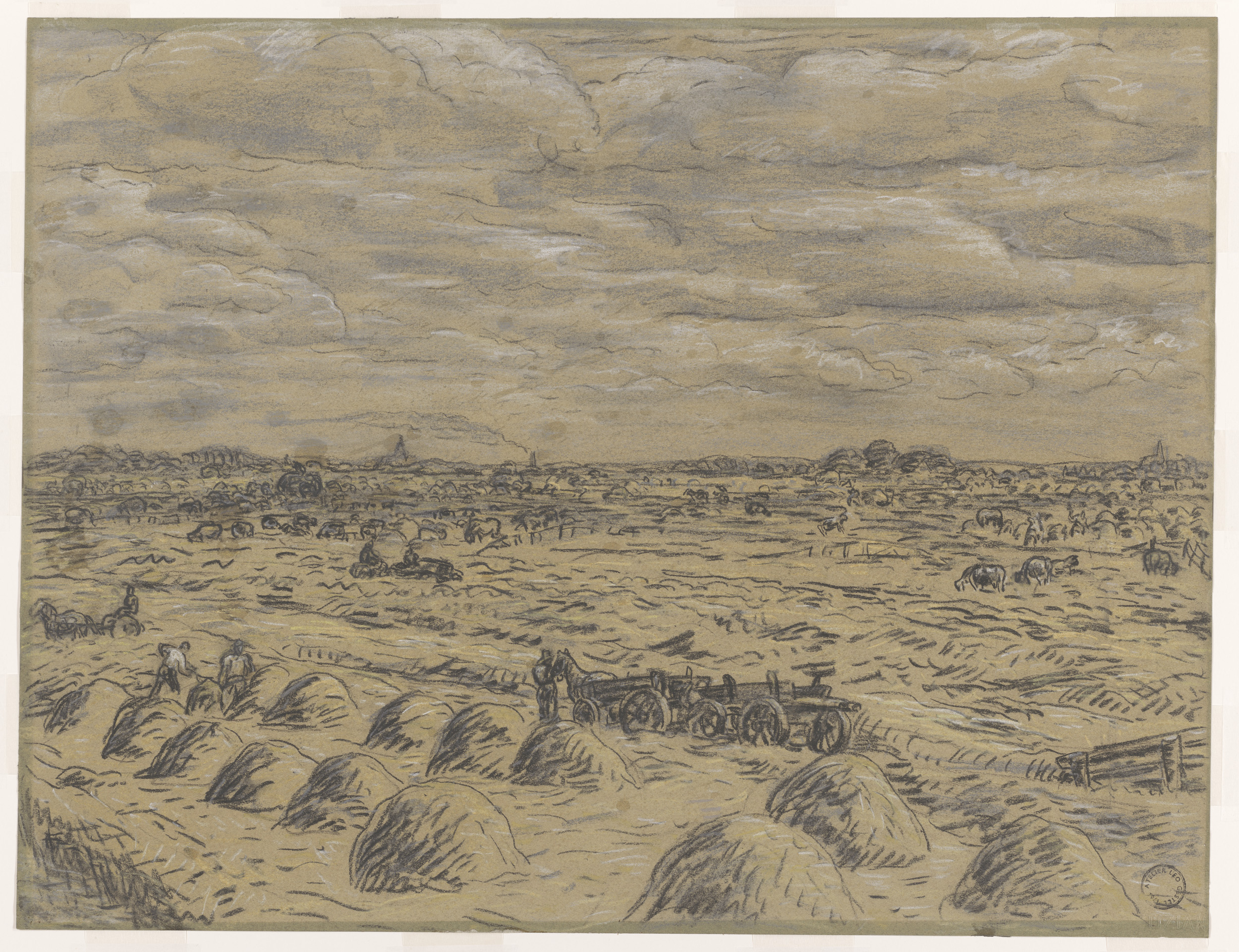 Aardappelrooiers op het land met paard en wagen