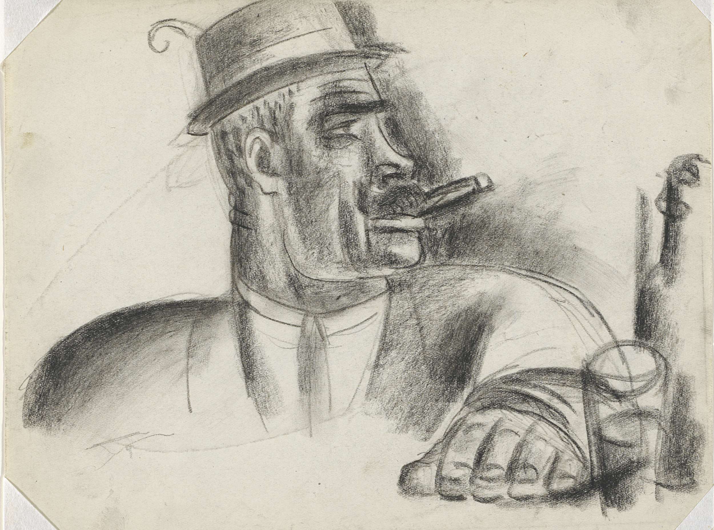 Portret van jager, en profil, met hoed op en sigaar ...