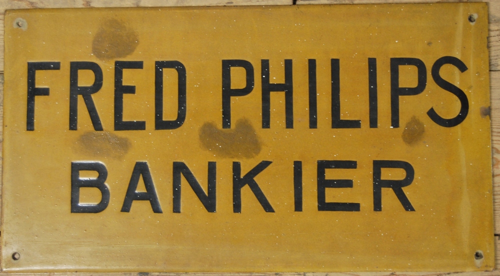Uithangbord van koper " Fred Philips Bankier" te Zal...