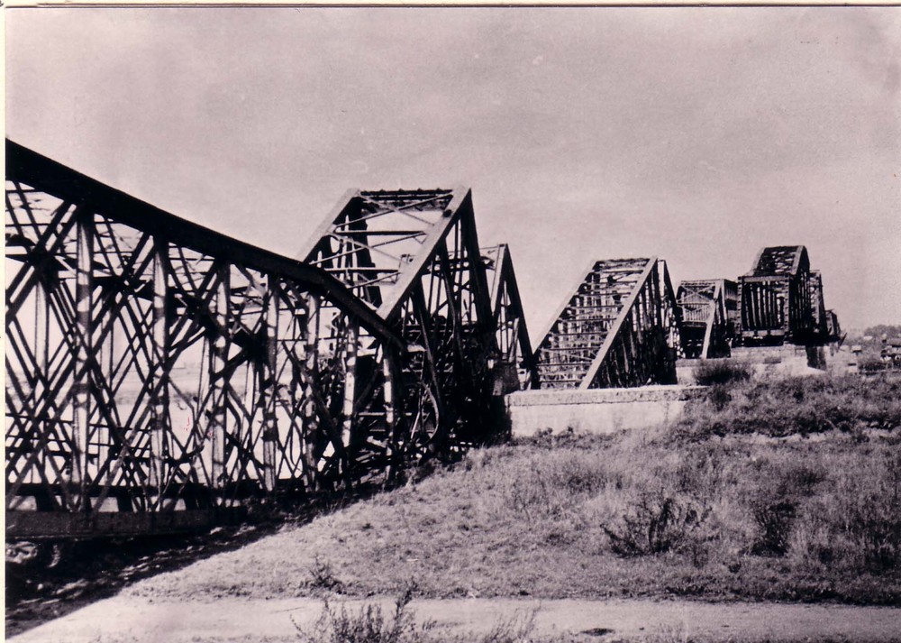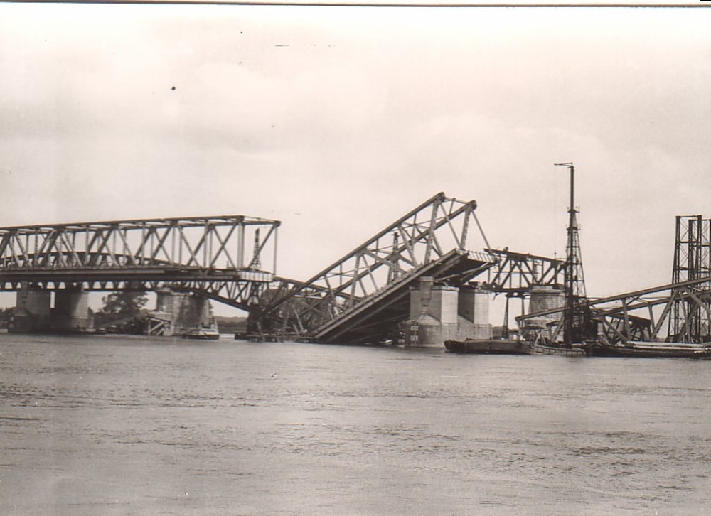 Verwoeste spoorbrug bij Hedel.