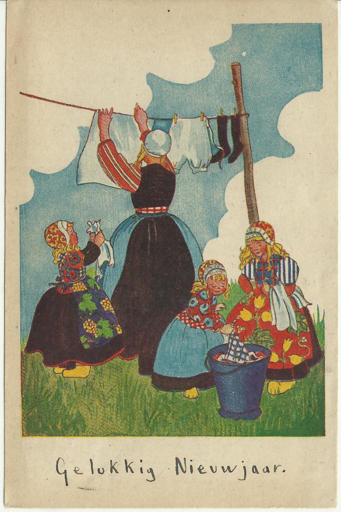 Moeder met kinderen in klederdracht. zij hangen buit...