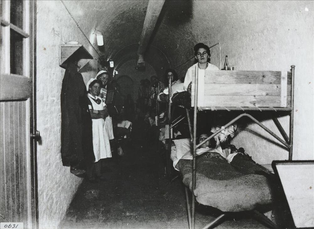 stapelbedden met zieken, verpleegsters in schuilkelder