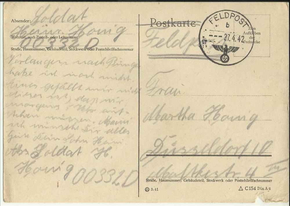 Briefkaart van Heinrich (soldaat) Honig aan Martha H...