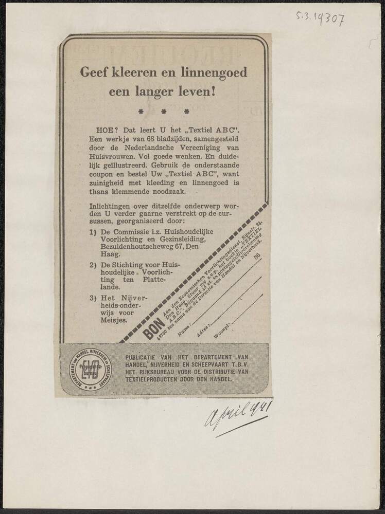 Vel met opgeplakte advertentie: "Geef kleeren en lin...