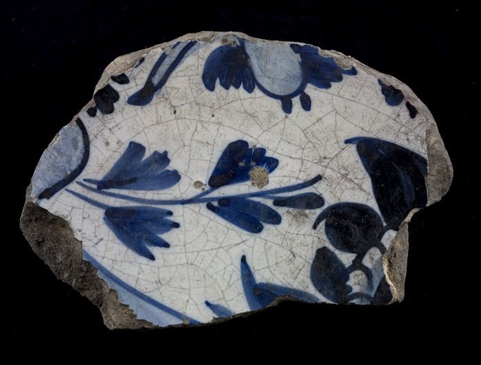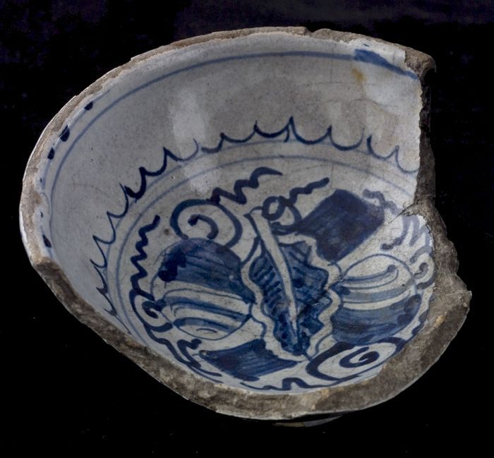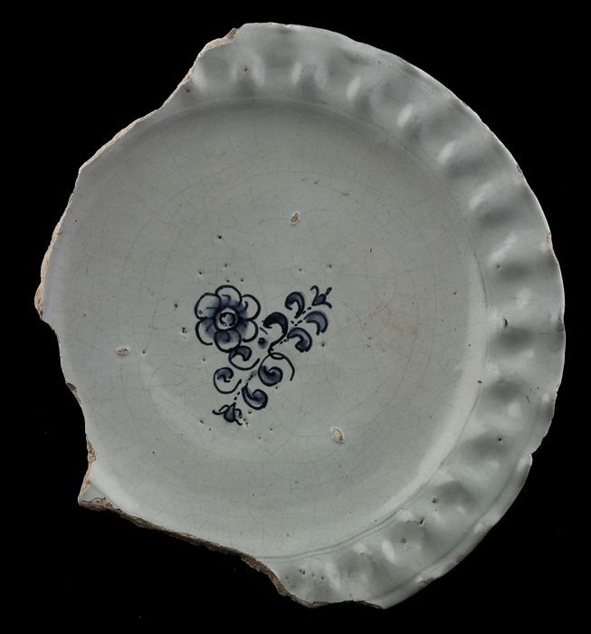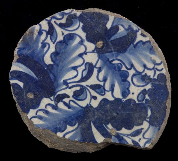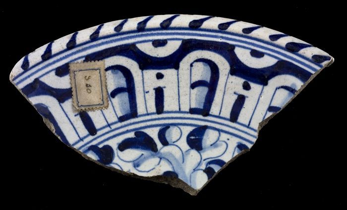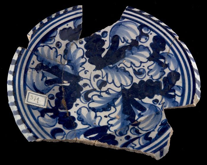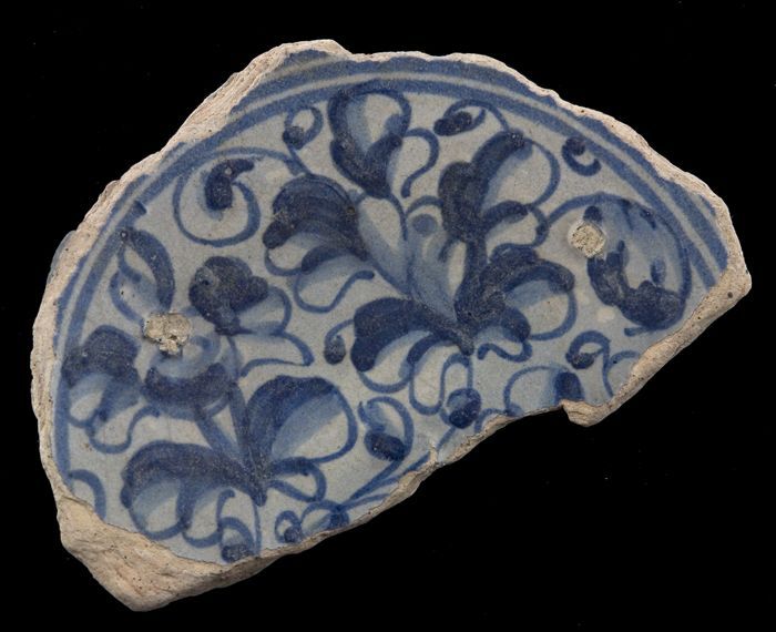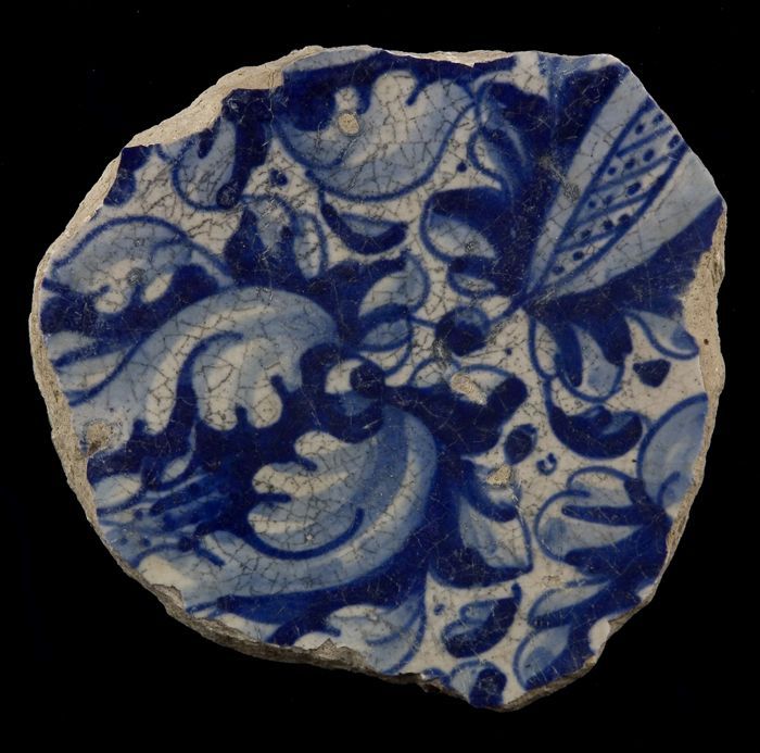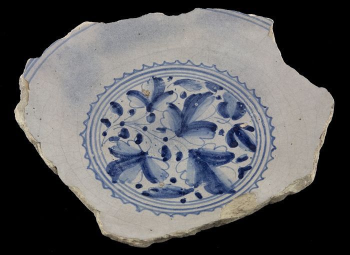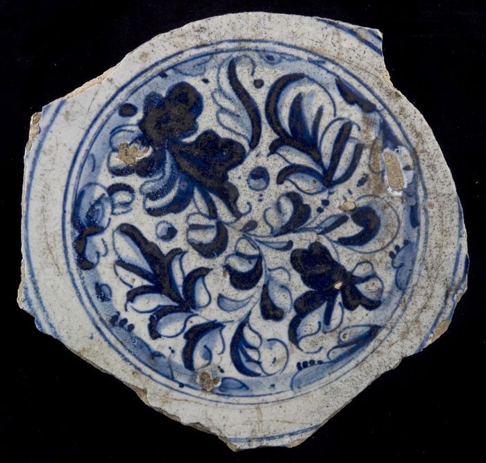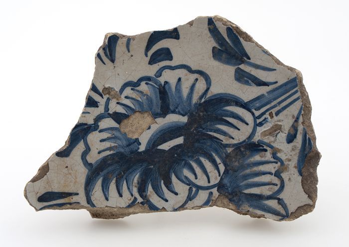 Fragment majolica schotel, blauw op wit, a-foglie de...