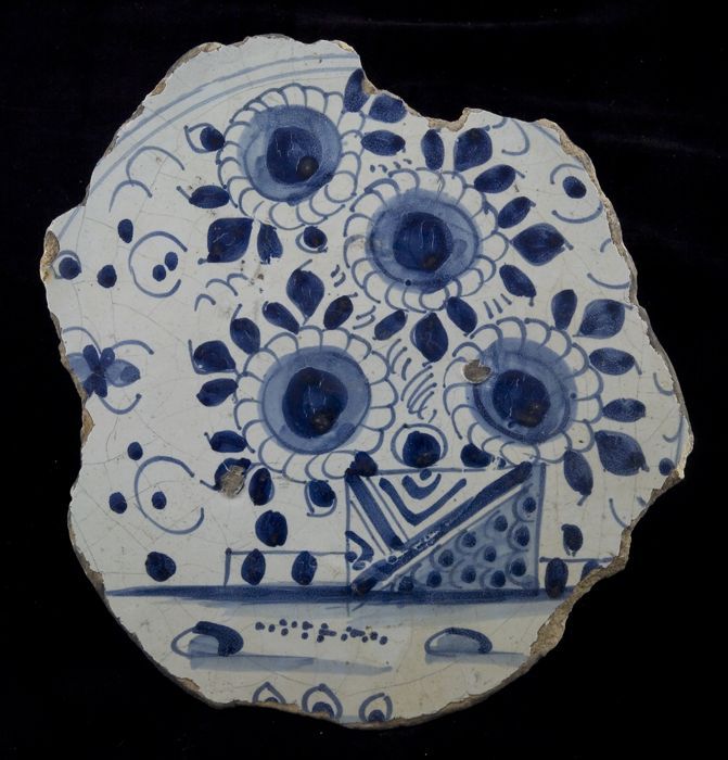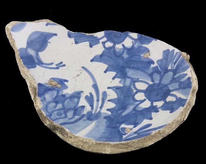 Fragment majolica schotel, blauw op wit, bloemen in ...