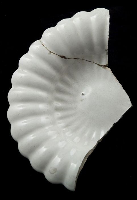 Fragment faience plooischotel, wit tinglazuur, dubbe...