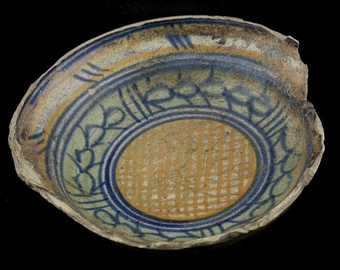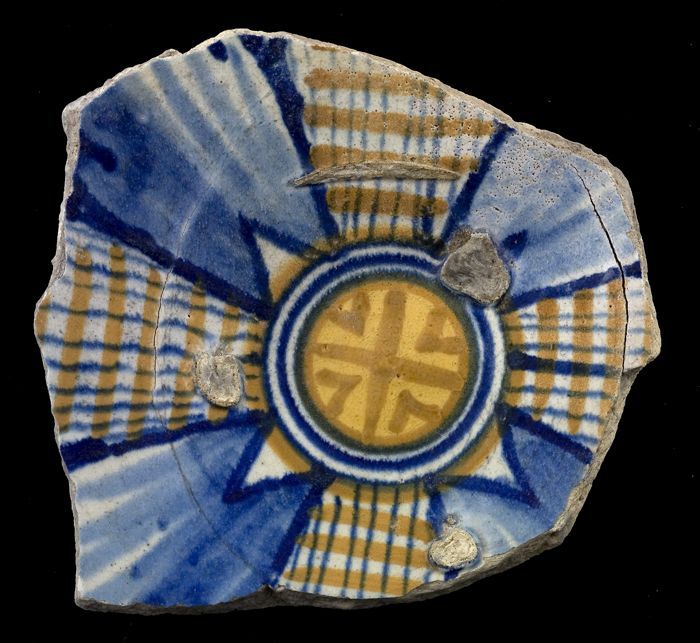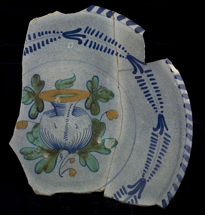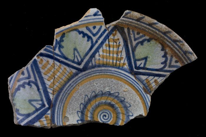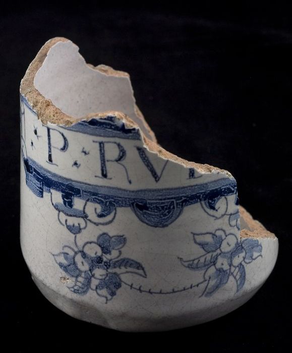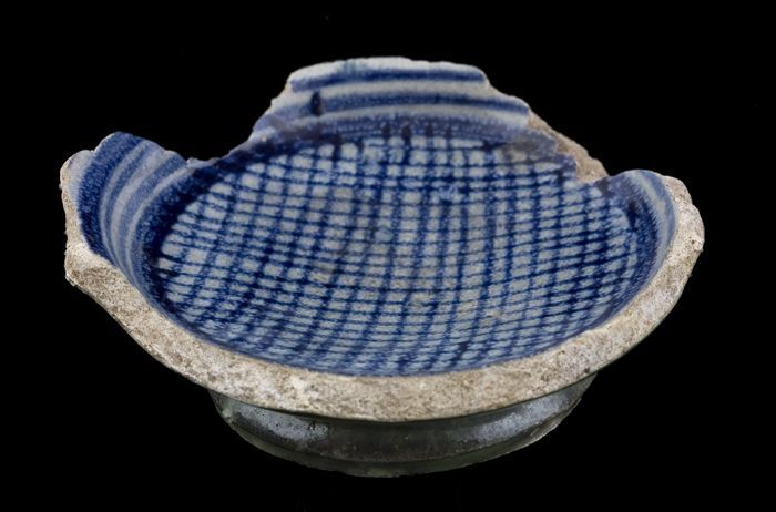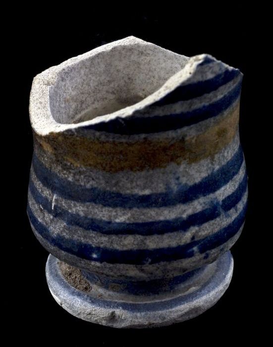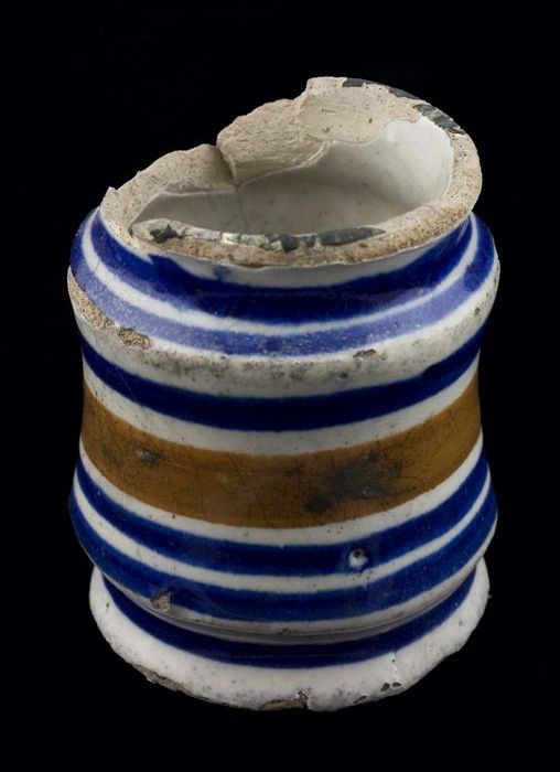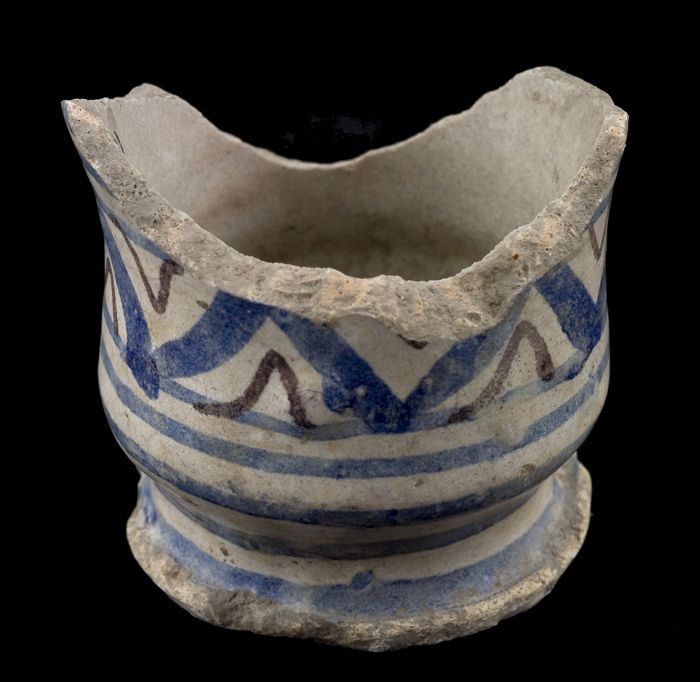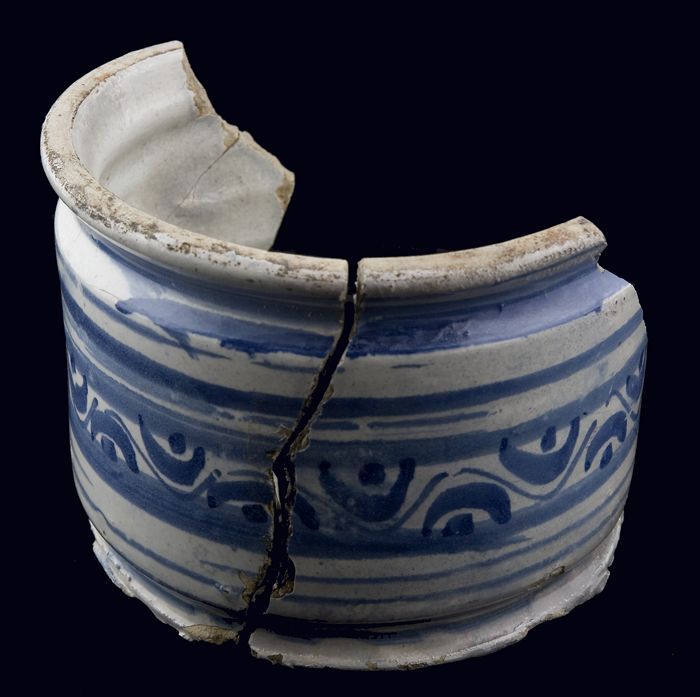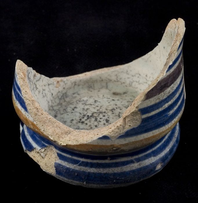 Fragmenten van majolica zalfpot, blauw zigzagdecor o...