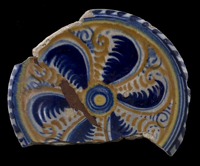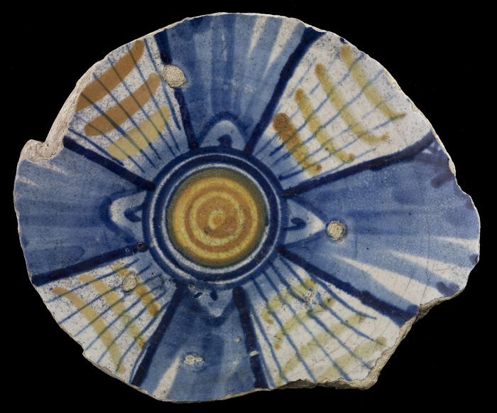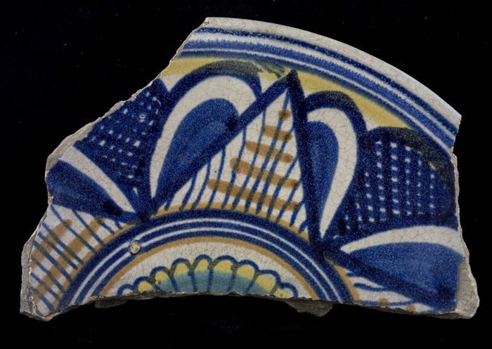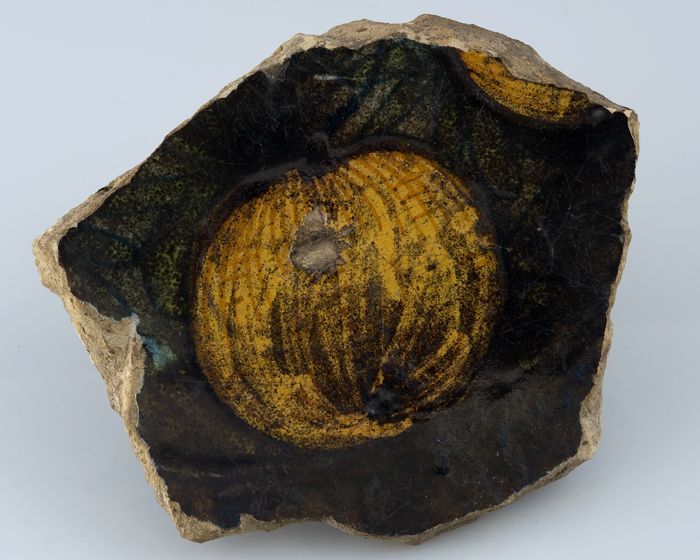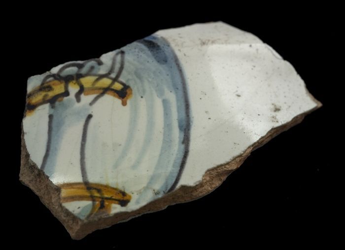 Fragment majolica schotel, geel, oranje en blauw op ...
