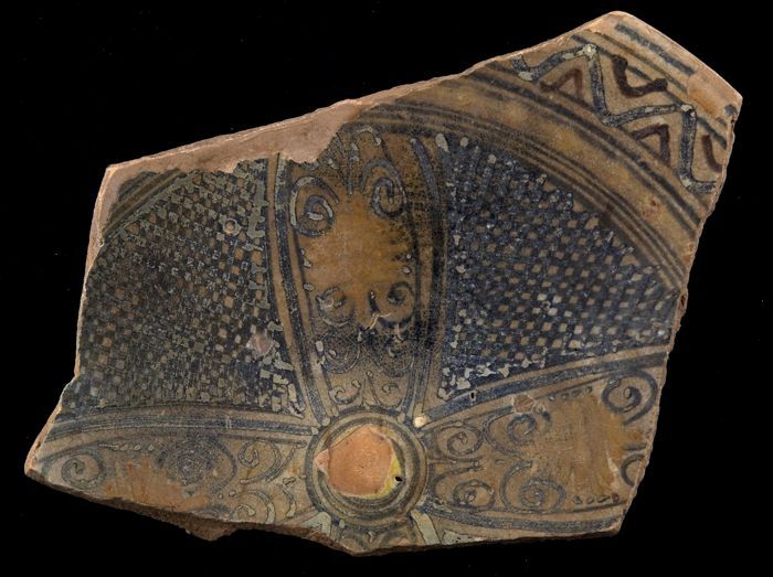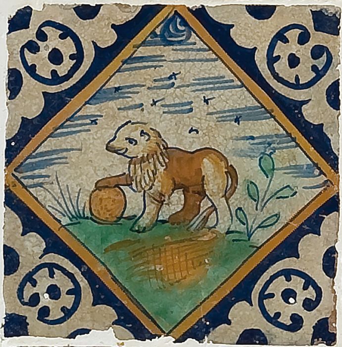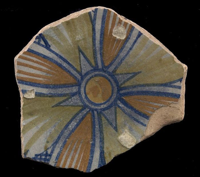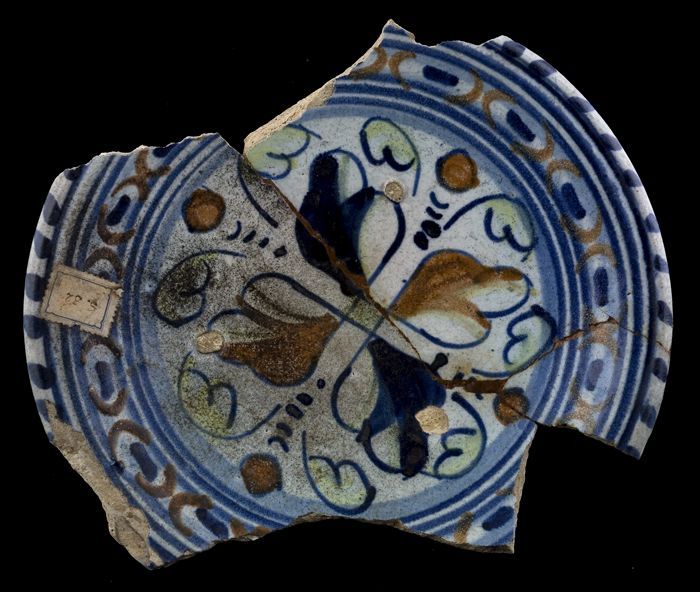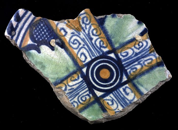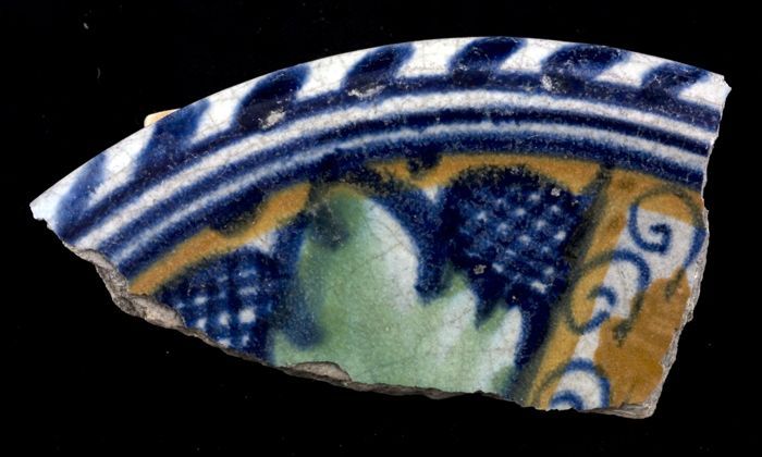 Fragment majolica schotel, bruin, groen en blauw op ...