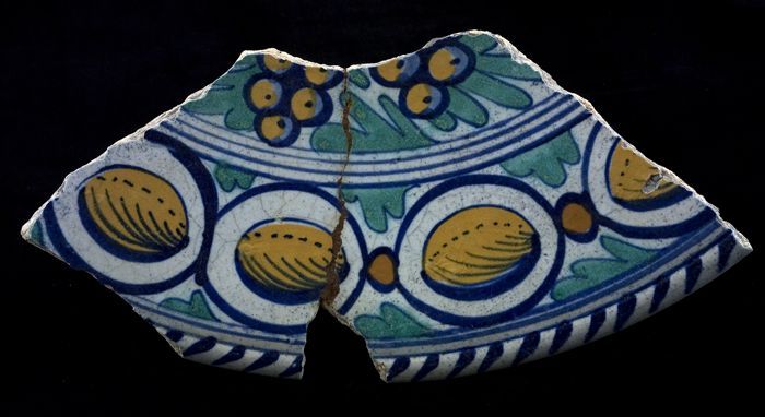 Fragment majolica schotel, polychroom, vrucht met ui...