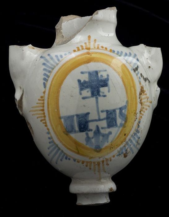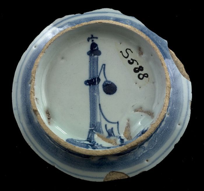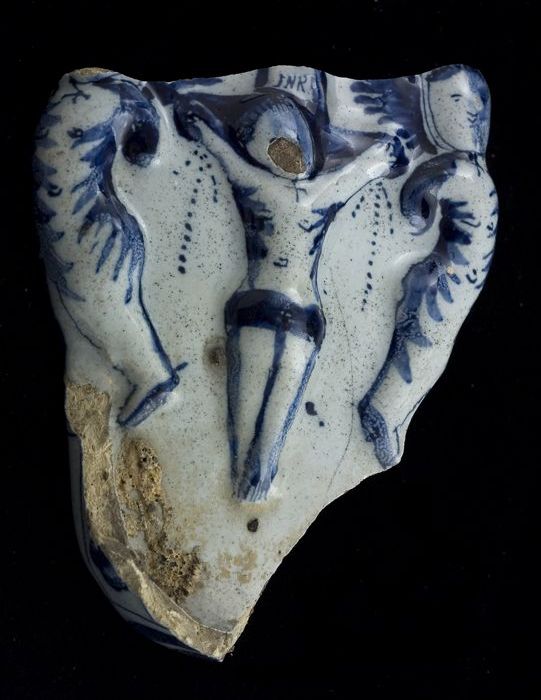 Deel van faience wijwaterbak, blauw op wit met Chris...