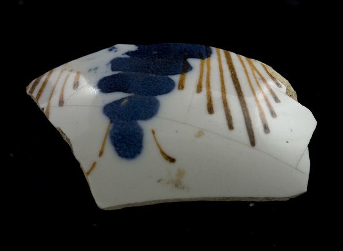 Fragment majolica schotel, paars en blauw op wit (?)...