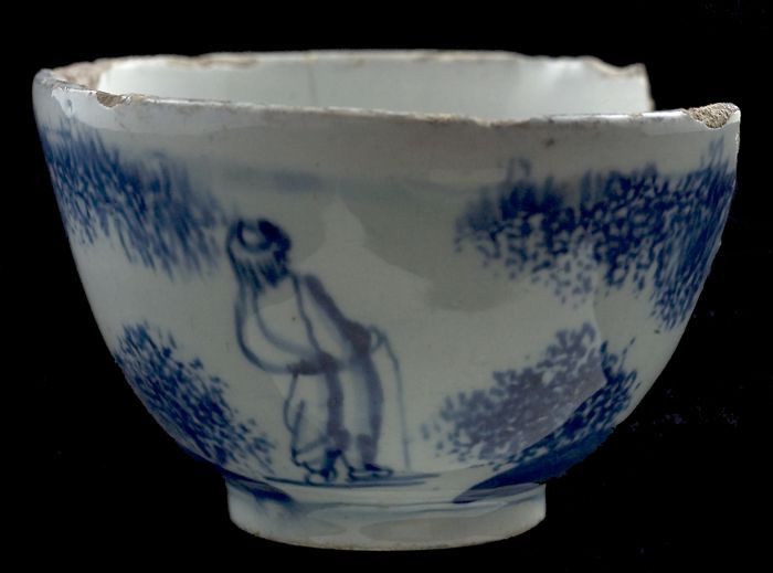 Fragment faience kom, blauw op wit, Chinees motief m...