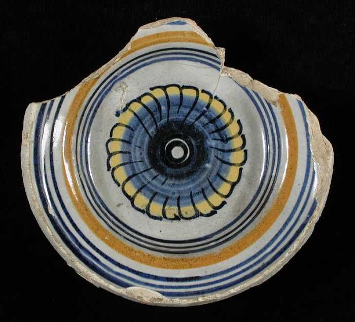 Fragment majolica zoutschaal, geel en blauw op wit, ...