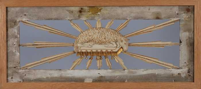 Gesneden, geverfd en verguld houten raam: het lam op...
