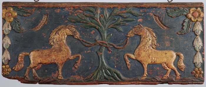 Houten paneel met in hout gesneden paard, waarschijn...