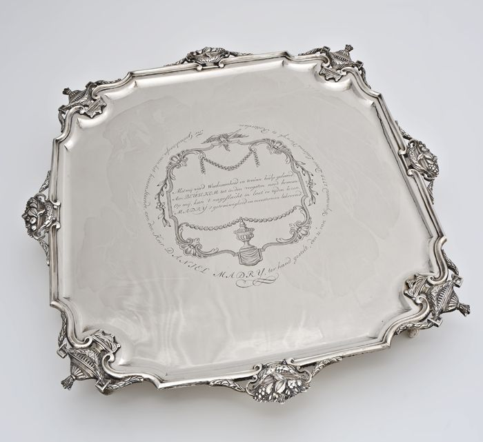Zilveren dienblad op pootjes met "... Aan den Heer D...