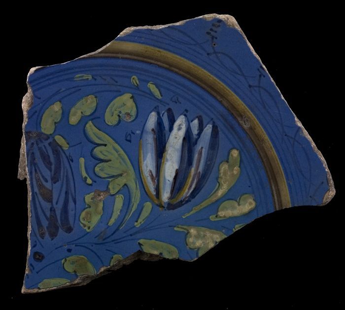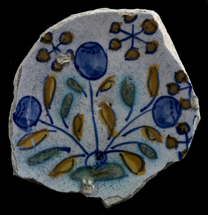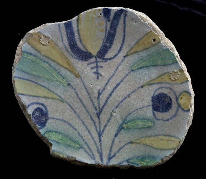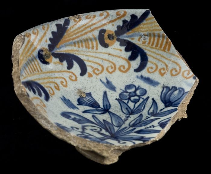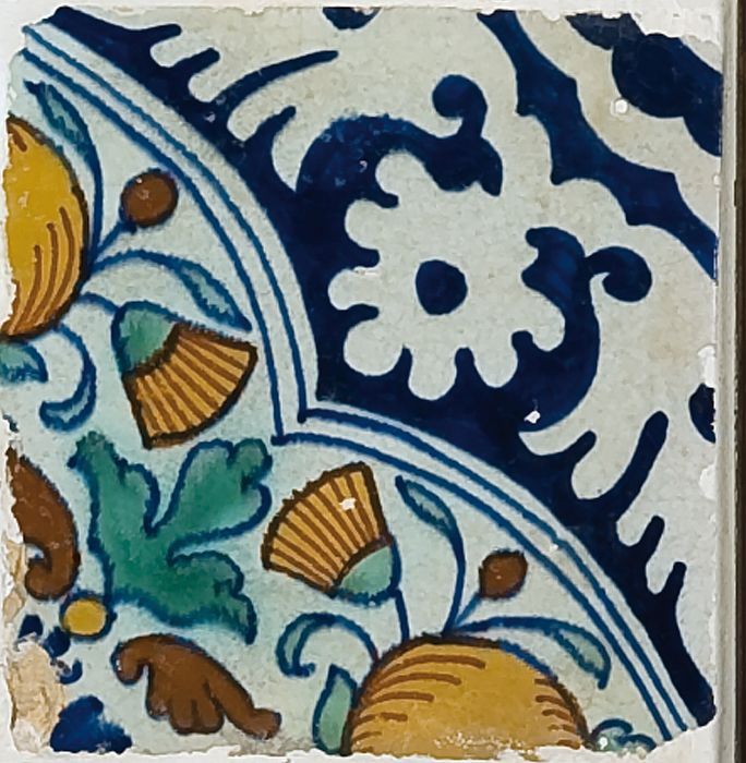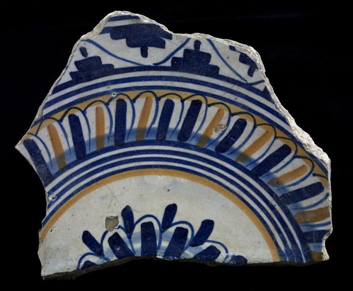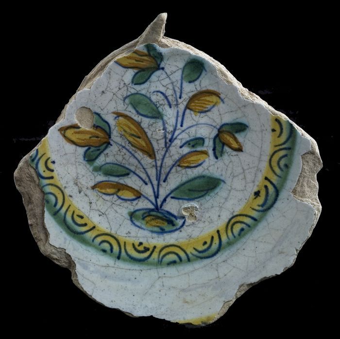 Fragment majolica schotel, blauw, geel, groen, wit e...