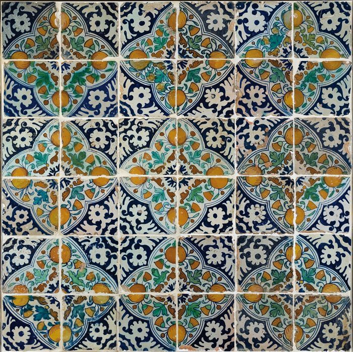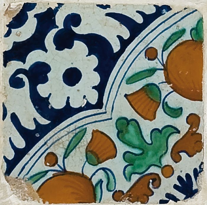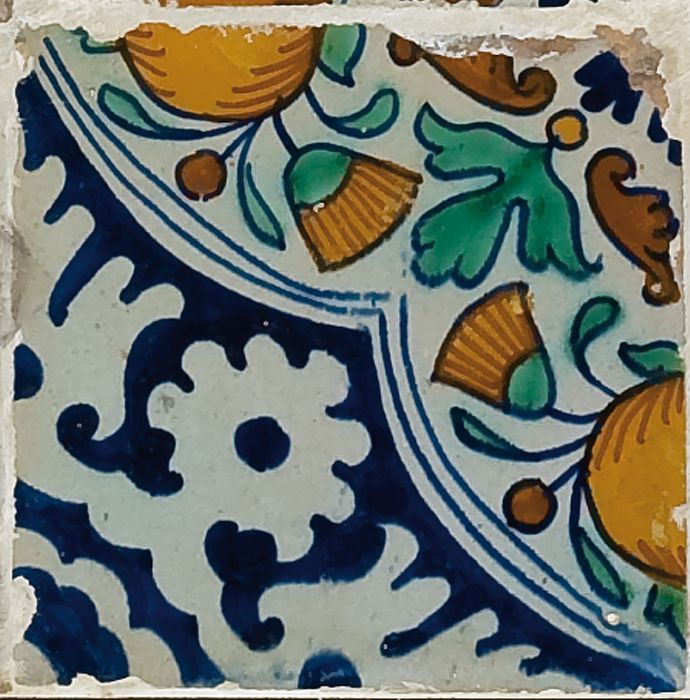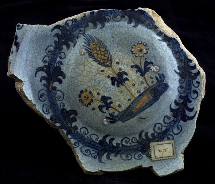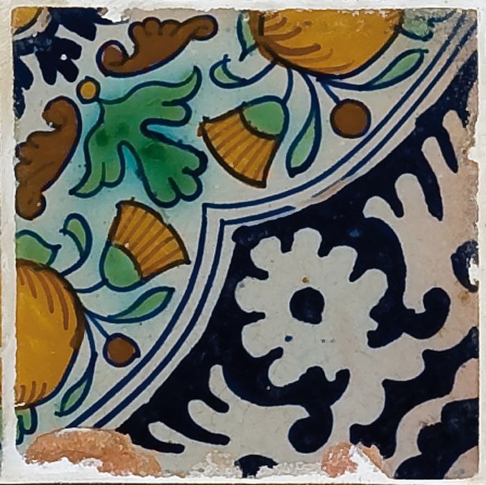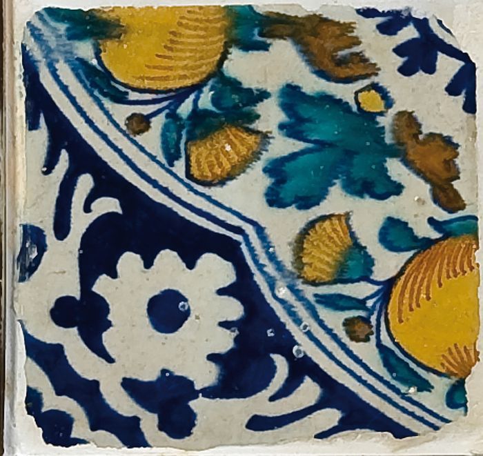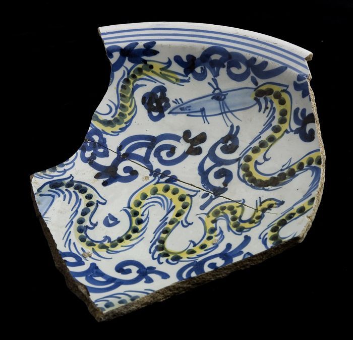 Fragment majolica schotel, blauw, geel, groen, wit e...