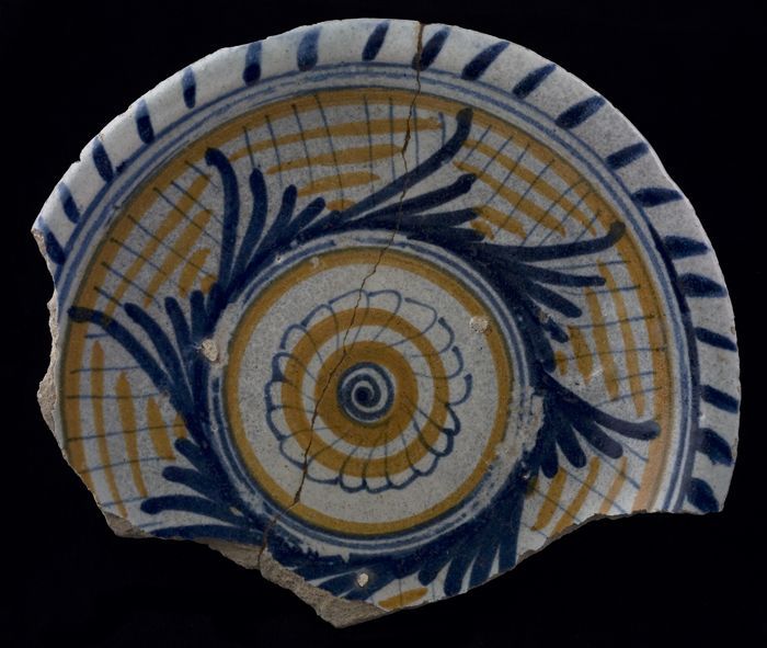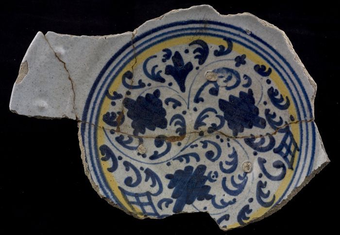Twee fragmenten van majolica schaal, geel en blauw o...