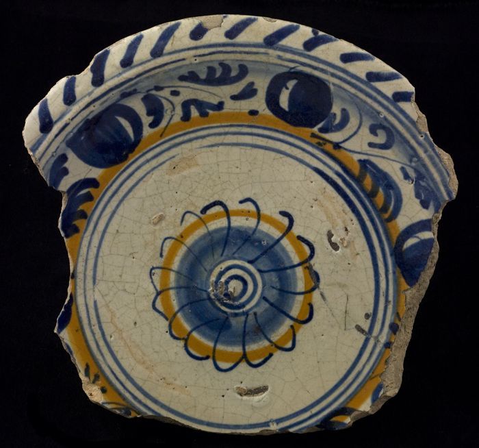 Fragment majolica schotel, geel en blauw op wit, blo...