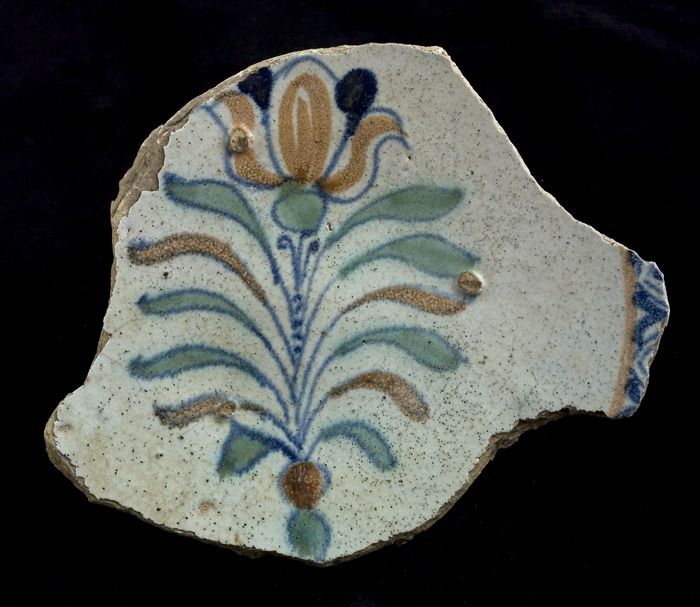 Fragment majolica schotel, polychroom, bloem met sli...
