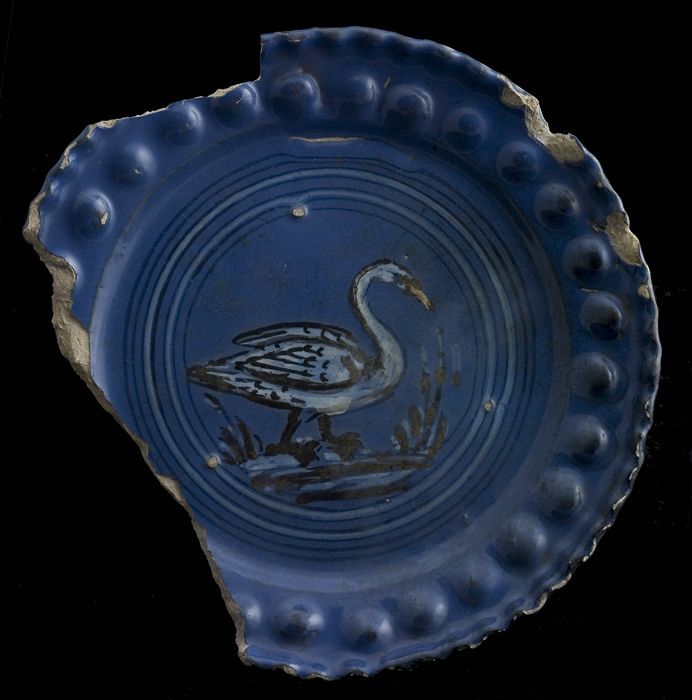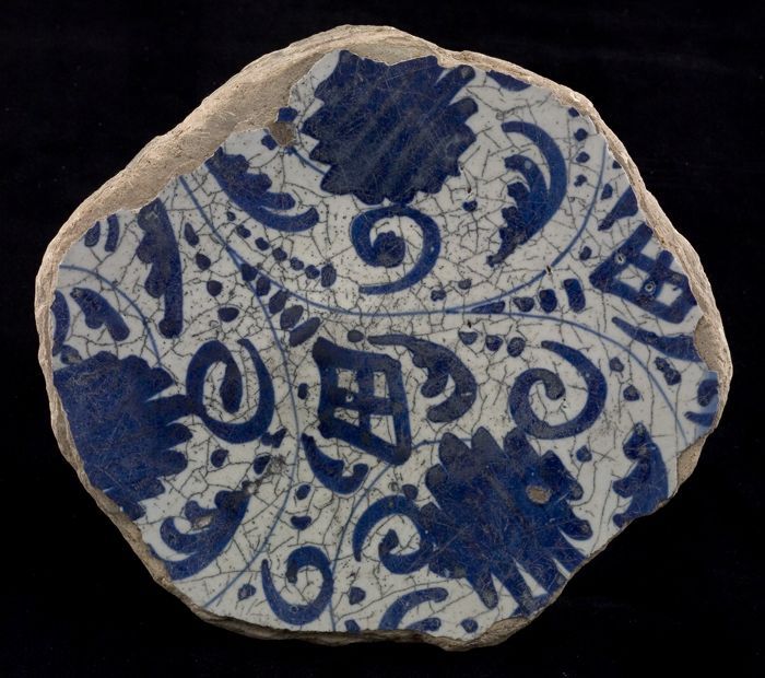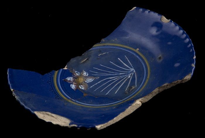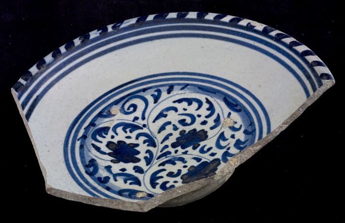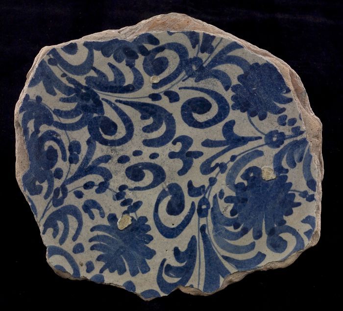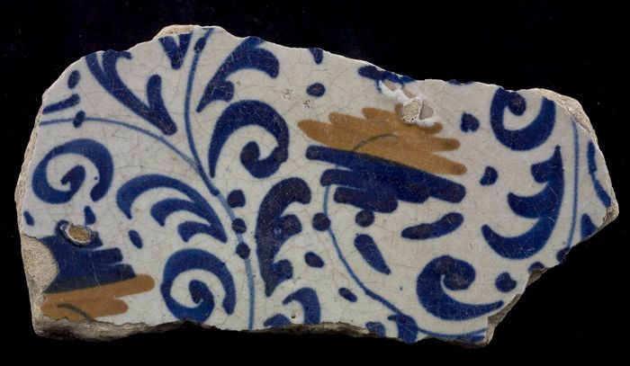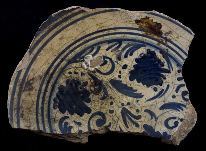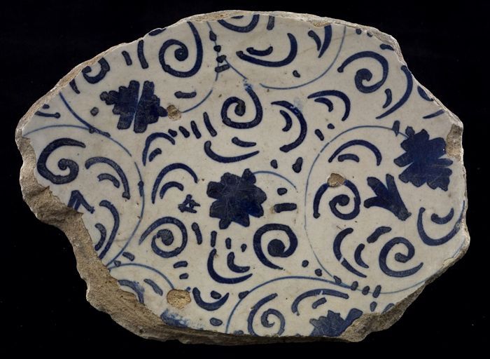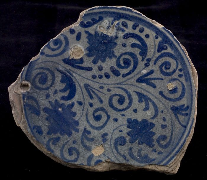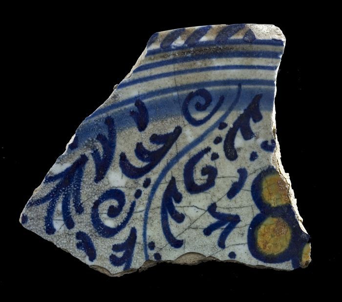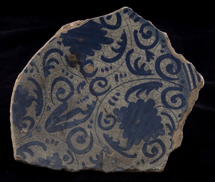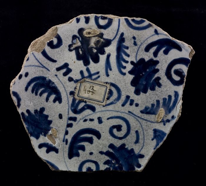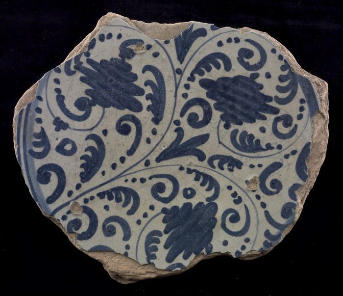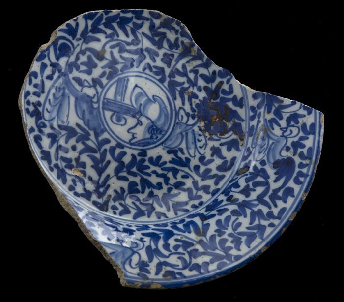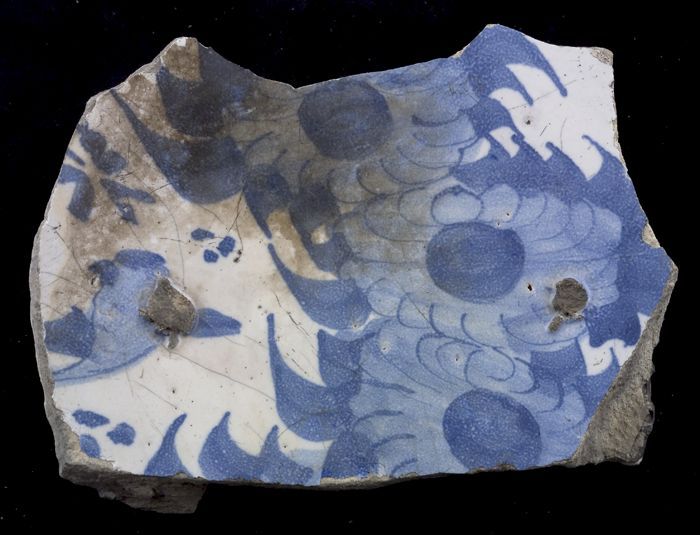 Fragment majolica schotel, blauw op wit, details ora...