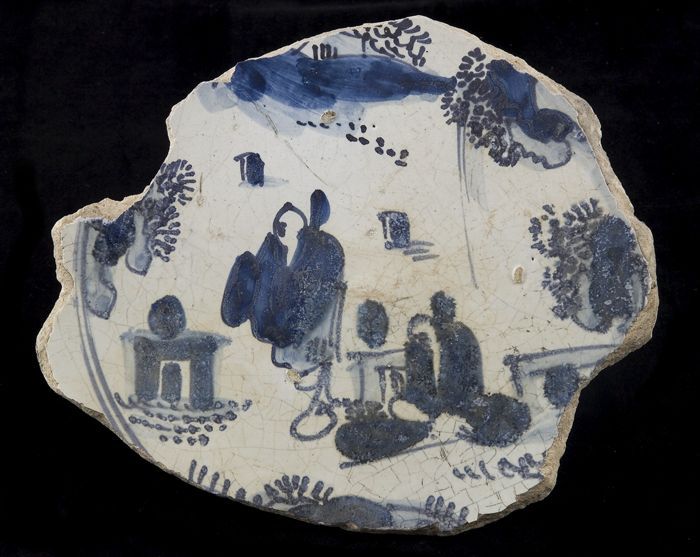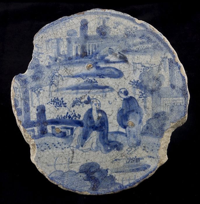Fragment majolica schotel, blauw op wit, met een fru...