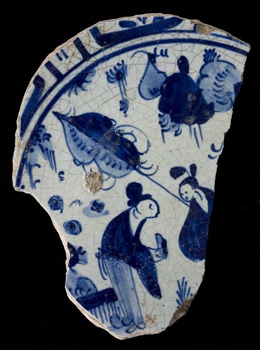 Fragment majolica schotel, blauw op wit, Chinezen, r...