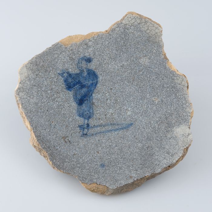 Fragment faience schotel, blauw op wit, één staande ...