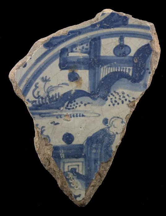 Fragment majolica schotel, blauw op wit, Chinees lan...