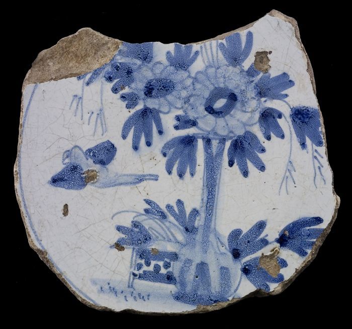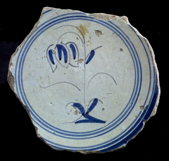 Fragment majolica schotel, blauw op wit, drietulp, tulp