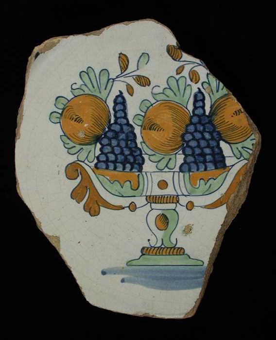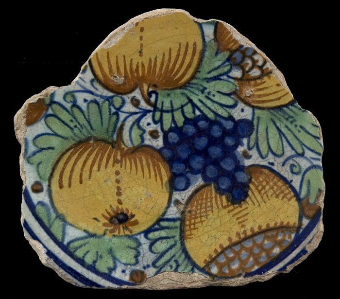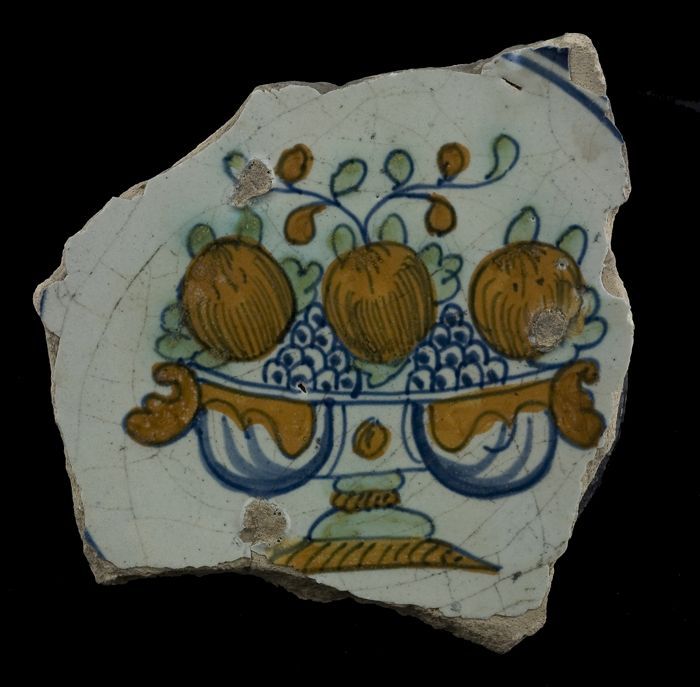Fragment majolica schotel, polychroom, appels, grana...