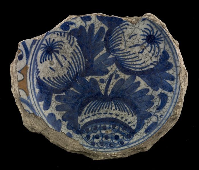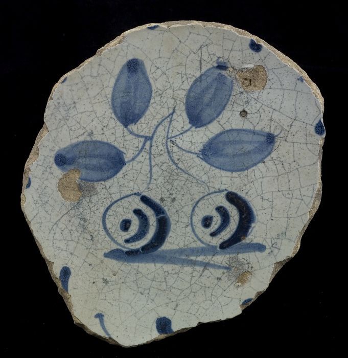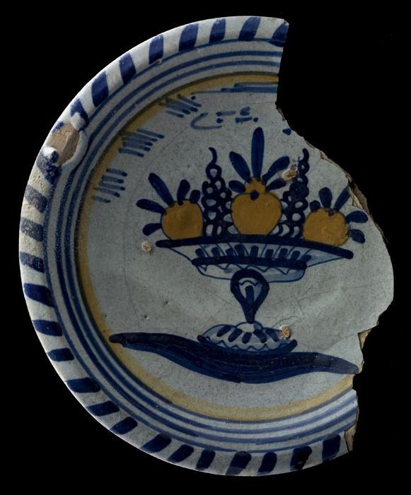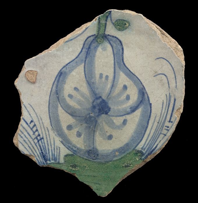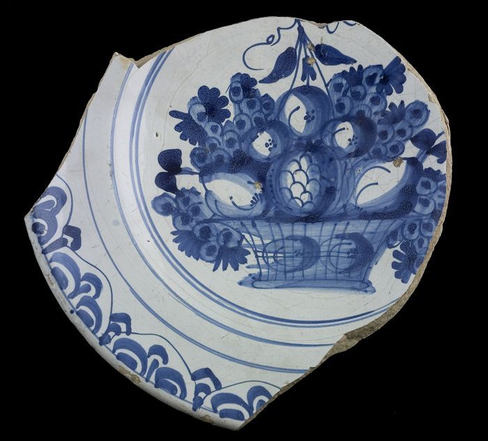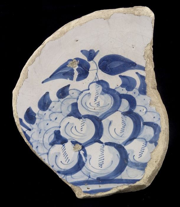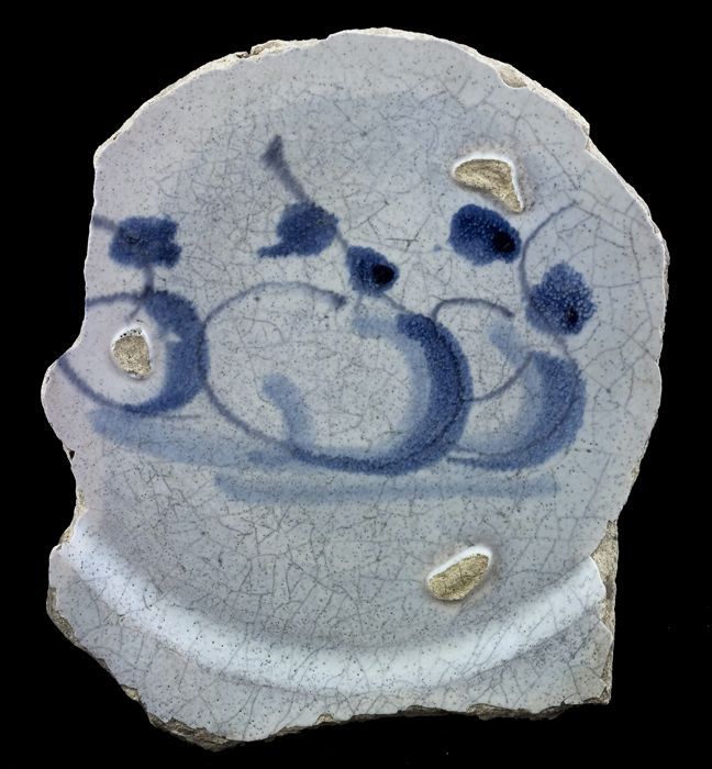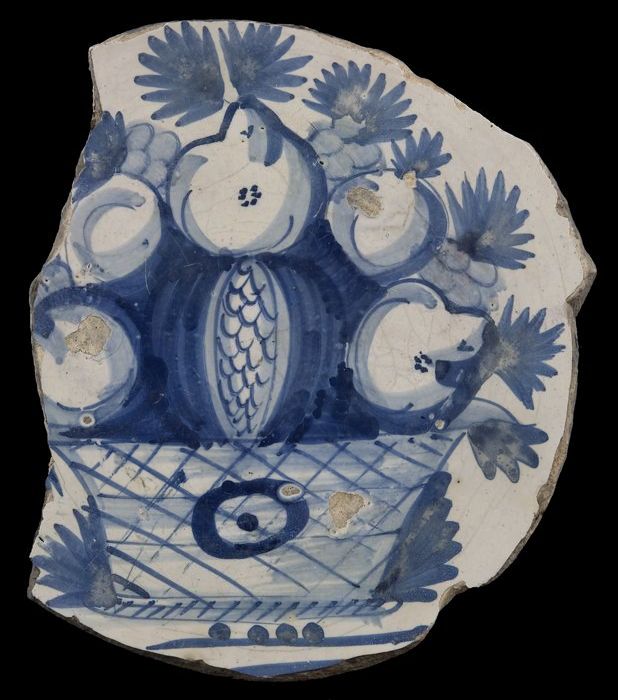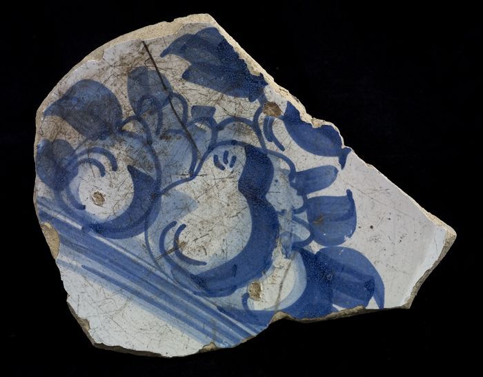 Fragment majolica schotel, blauw op wit, stilleven i...