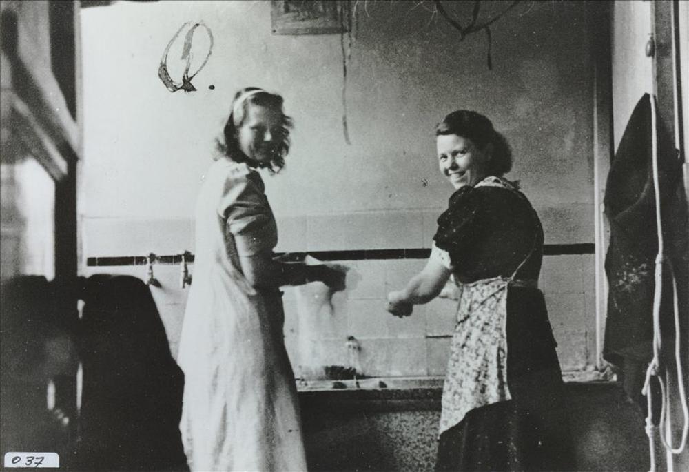 twee jonge vrouwen staan te wassen bij een aanrecht