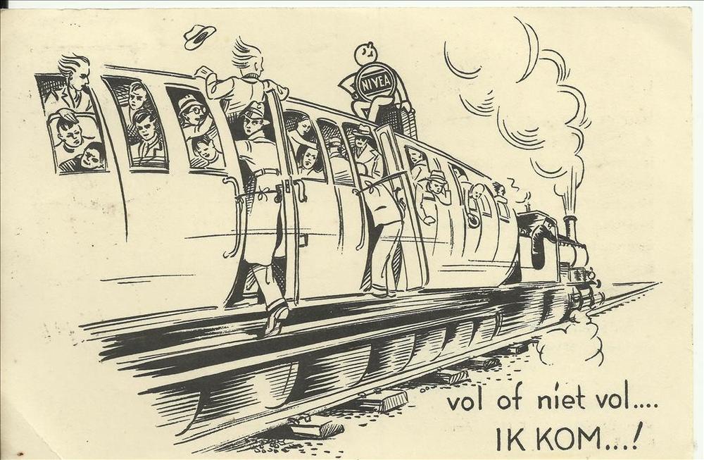Ansichtkaart van reizende verkoper. 'Vol of niet vol...