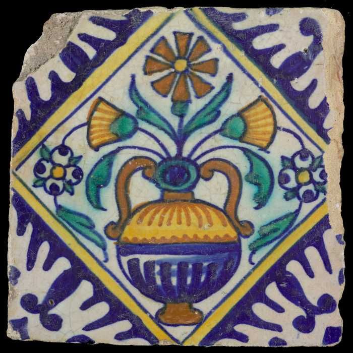Fragment majolica bord, blauw op wit, bloemenvaas in...