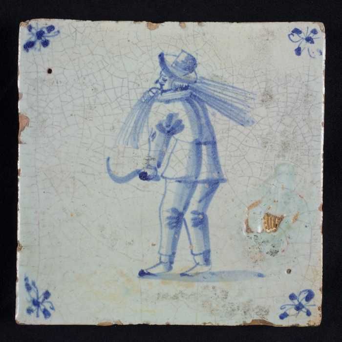 Figuurtegel, blauw, rietbinder met sikkel, hoekmotie...