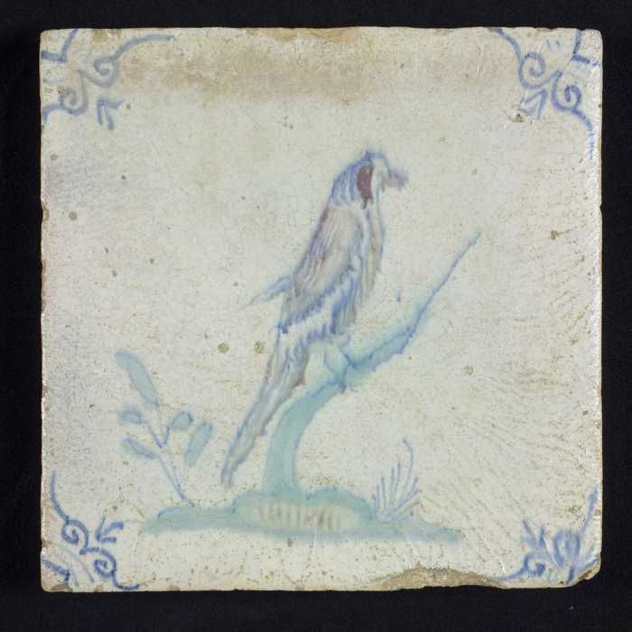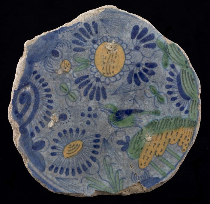 Fragment majolica bord, polychroom, vogel in Chinese...