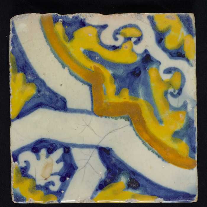 Fragment majolica schotel, geel en blauw op wit, met...