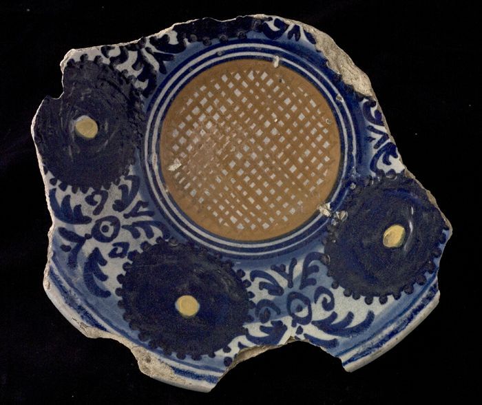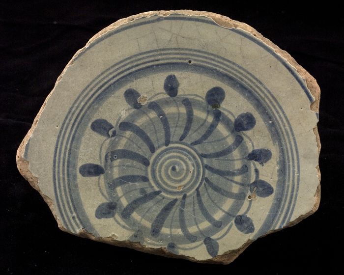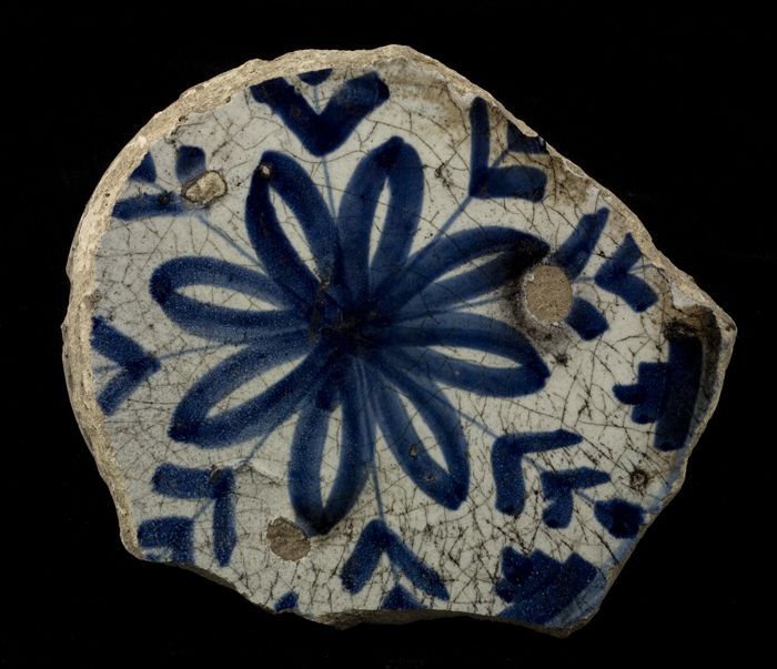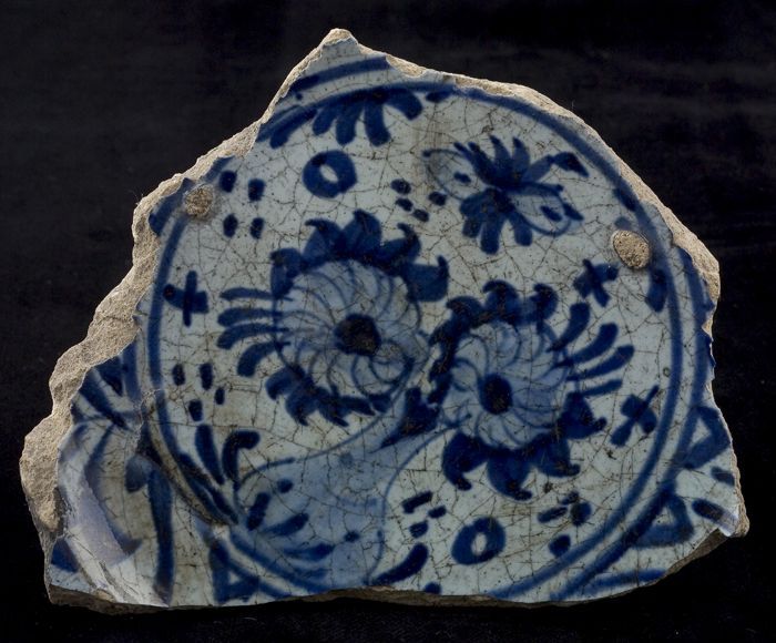 Fragment majolica (?) bord, blauw op wit, bloemrozet...