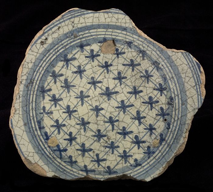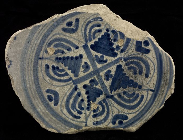 Fragment majolica schotel, blauw op wit, met achtpun...